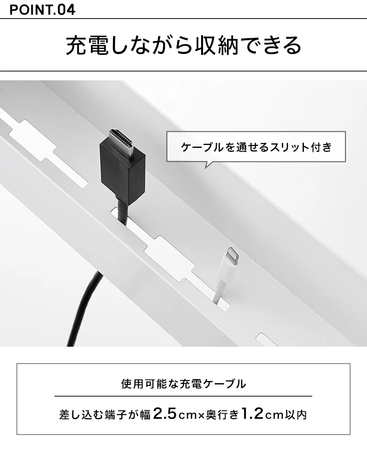 ■対応サイズ差し込む端子がW2.5×D1.2cm以内の充電ケーブル※収納する物の充電の仕様によっては、ご使用いただけません。