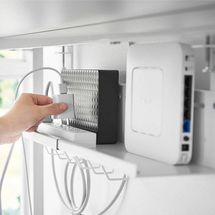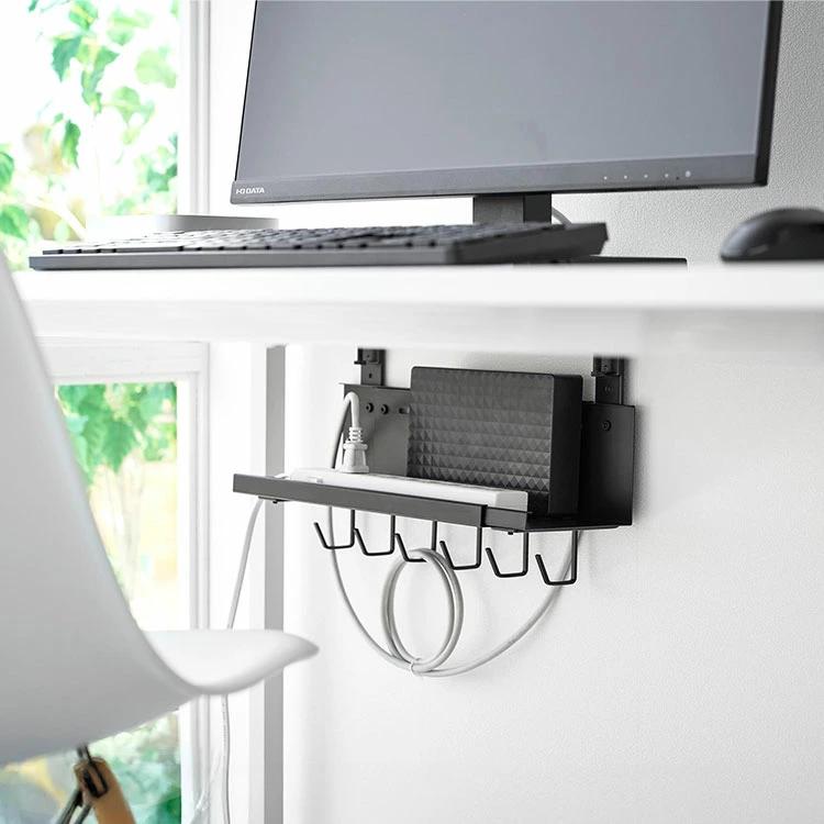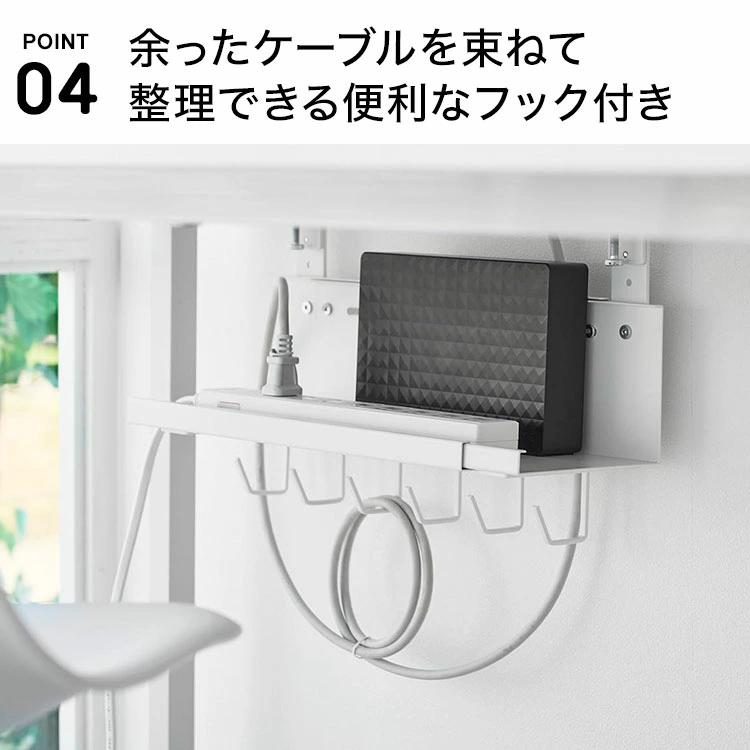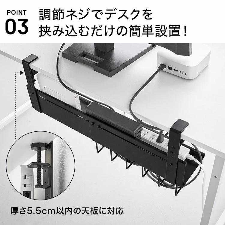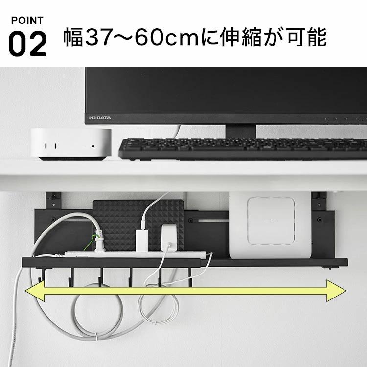 【伸縮デスク下ケーブルトレー】デスクの天板を挟み込むだけで簡単に設置できる、幅37~60cmに伸縮可能なデスク下収納トレーです。散らかりがちなケーブルやタップ類を浮かせて収納できるので、デスク下がスッキリ片付き、床掃除もラクラク。デスク天板と本体トレーの間にゆとりがあるため、本体設置後でもハードディスクやルーターのセッティングがスムーズに行えます。余ったケーブルを束ねて整理できる便利なフック付き。厚さ5.5cm以内の天板に対応しています。