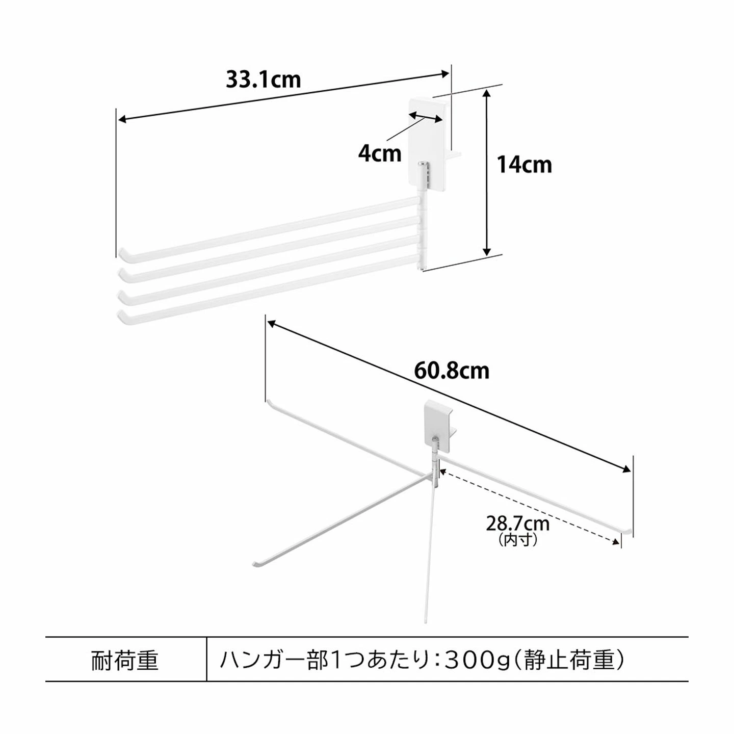 ■サイズ本体:約W4×D33.1×H14cm使用時最大:約W60.8×D60.8×H14cmハンガー部1つあたり:約W28.7cm
