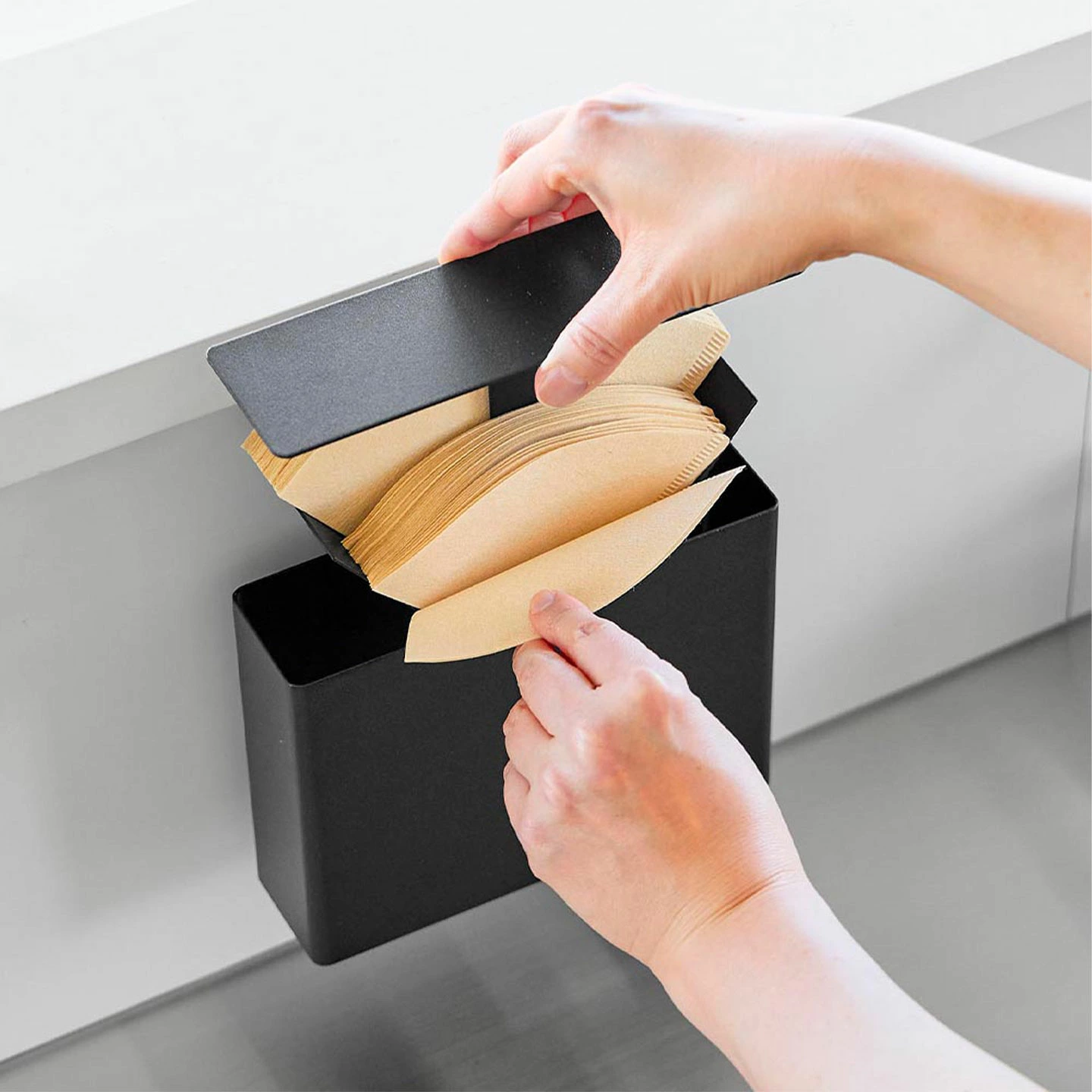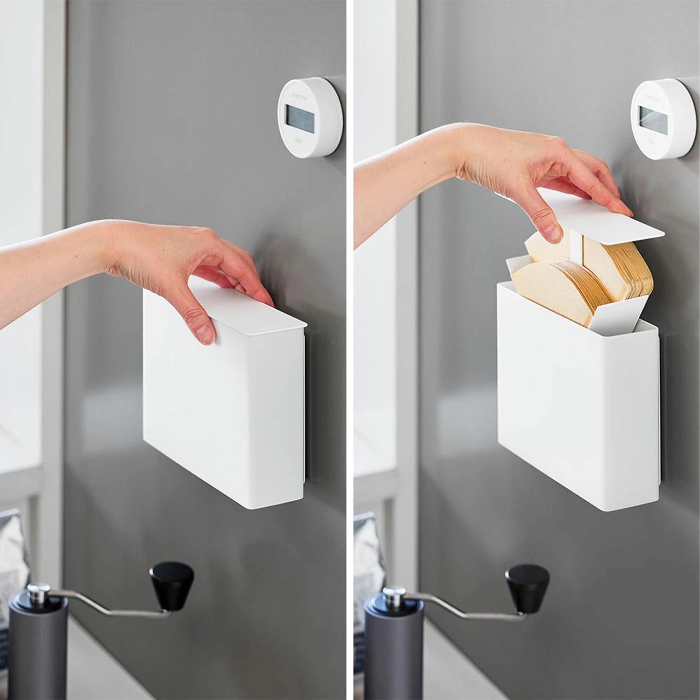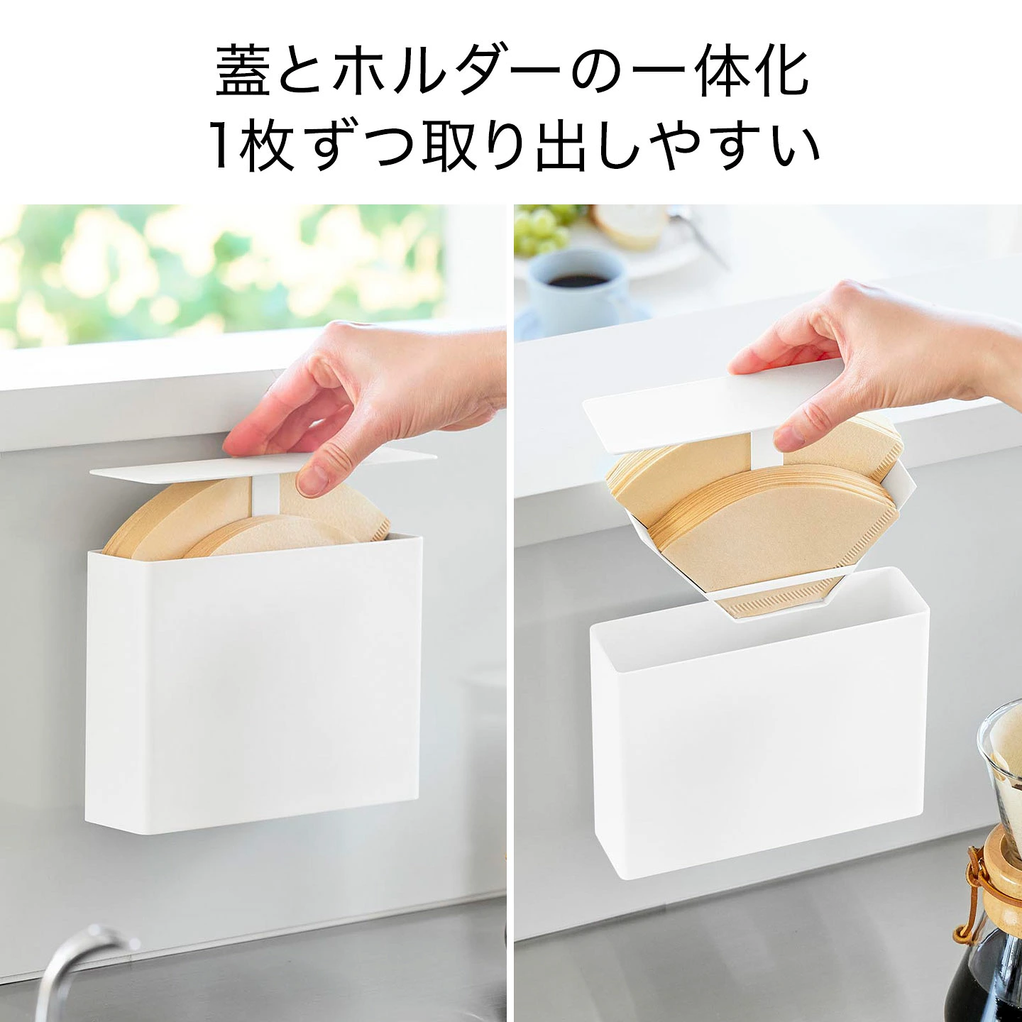 【マグネットコーヒーペーパーフィルターケース 】マグネットで簡単に取り付けられるコーヒーペーパーフィルターケースです。蓋付きなのでほこりが入りにくく、清潔に保管できます。円すい形フィルターにも対応。中央に仕切りがあり、1-2杯用と2-4杯用を分けて収納可能です。蓋を持ち上げるだけで、フィルターを1枚ずつスムーズに取り出せます。