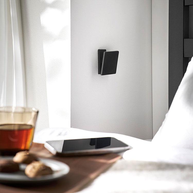 【角度が調節できる壁付けスマホホルダー】スマートフォンをお好みの角度に調節できる、壁付けホルダーです。上下左右、斜めにも首振り可能。ベッド周りやパウダールーム、デスク周りなど、さまざまな場所で活躍します。設置したまま充電が可能で、取り付けベースに掛けるだけの簡単取り付けです。