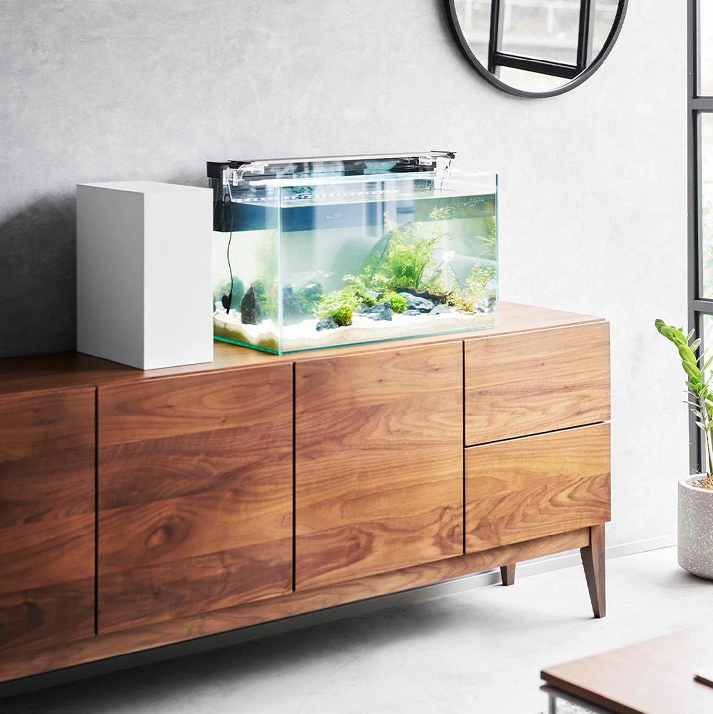【水槽横収納ボックス】水槽横に散らかりがちなエサやメンテナンス用品、電源コード類をまとめて収納できる2段式水槽横収納ボックス。取り外しできる仕切りトレー付き。観賞魚のお世話に必要なアイテムをまとめて収納できます。蓋は本体に掛けておくことができる構造です。背面からコードを出すことができます。上段の仕切りトレーには、エサやメンテナンス用品を収納することができます。ピンセットやハサミ等、長い物も立てて収納することができます。下段には電源タップやコード類を収納できます。別売りの水槽ラック(品番1961/1962)と一緒に置いても便利。