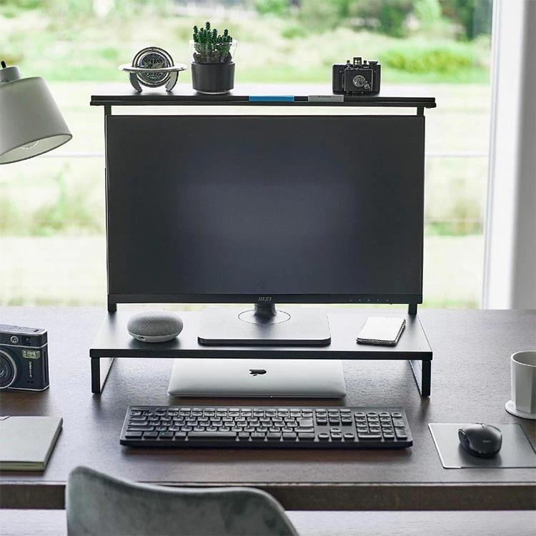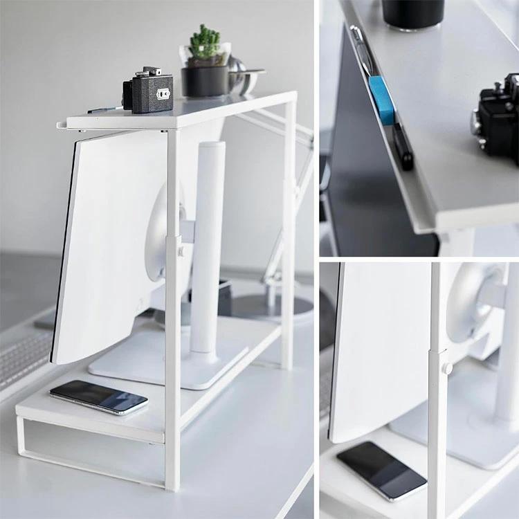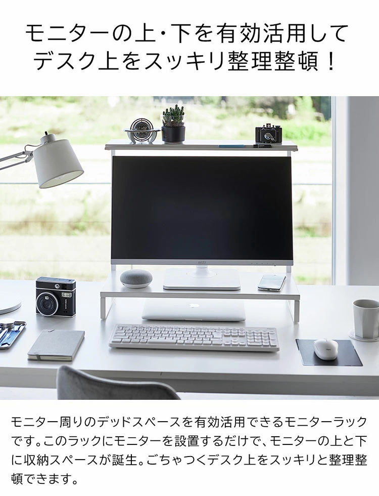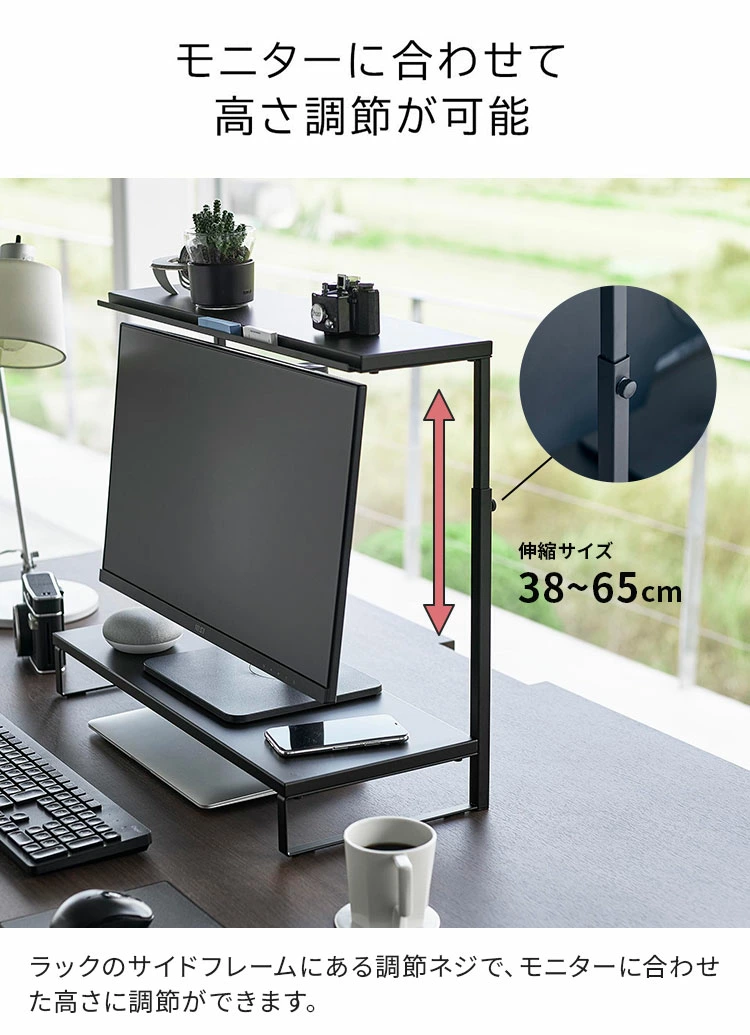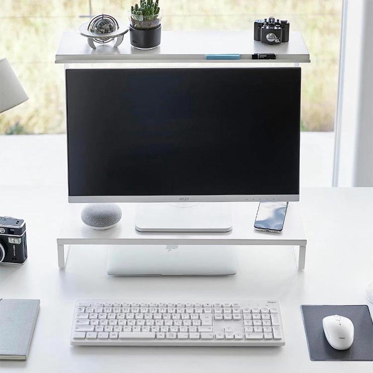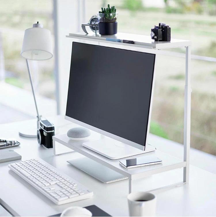 【モニター上下ラック 2段】モニターの上や下を有効活用できるラック。キーボードなどを下に収納することで、デスクをすっきり広々使うことができます。モニターに合わせて高さ調節が可能。上段の棚にはペンなどの小物を置くことができる溝があり便利です。