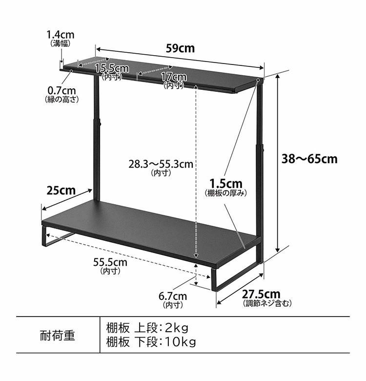 ■サイズ[ 外寸 ]約W59×D27.5×H38~65cm(調節ネジ含む)[ 内寸 ]棚板(上段):W59×D17(内、溝幅:1.4)cm棚板(下段):W59×D25×H28.3~55.3cm