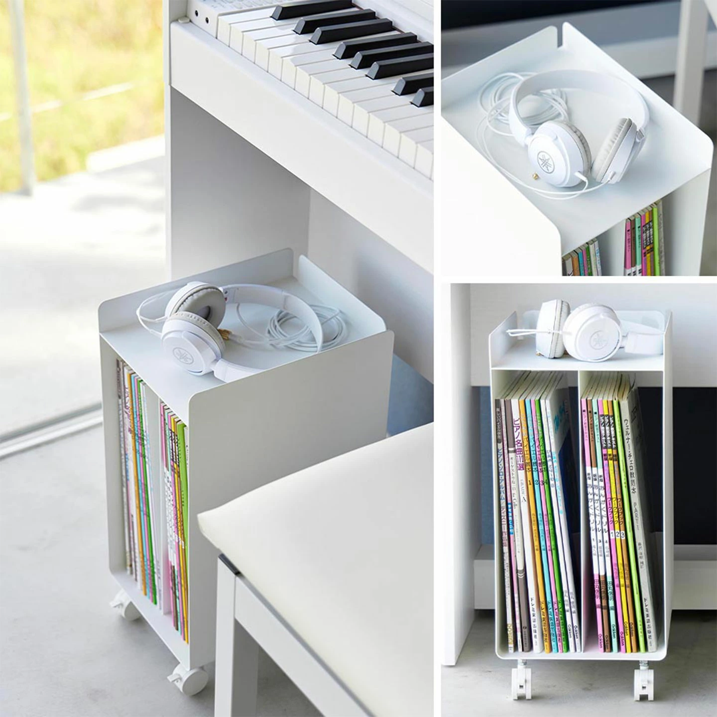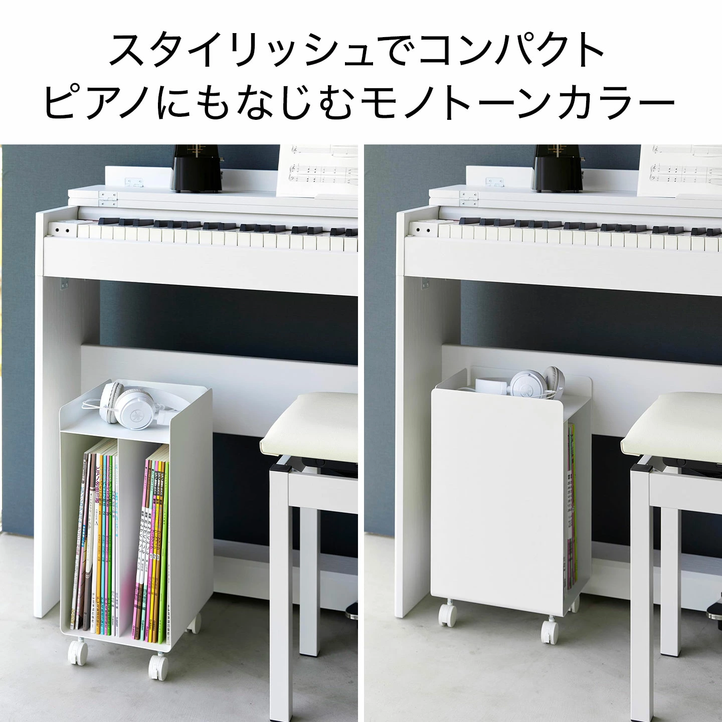 【ピアノ下楽譜収納ワゴン】ピアノの楽譜をスッキリまとめて足元に置けるキャスター付きのコンパクトなミニワゴン。置き場所に困る楽譜をピアノ下に収納できるワゴン。キャスター付きなので、移動もスムーズです。場所を取らず、コンパクトに収納できるサイズ。天板にはヘッドフォンなどの小物を置けます。