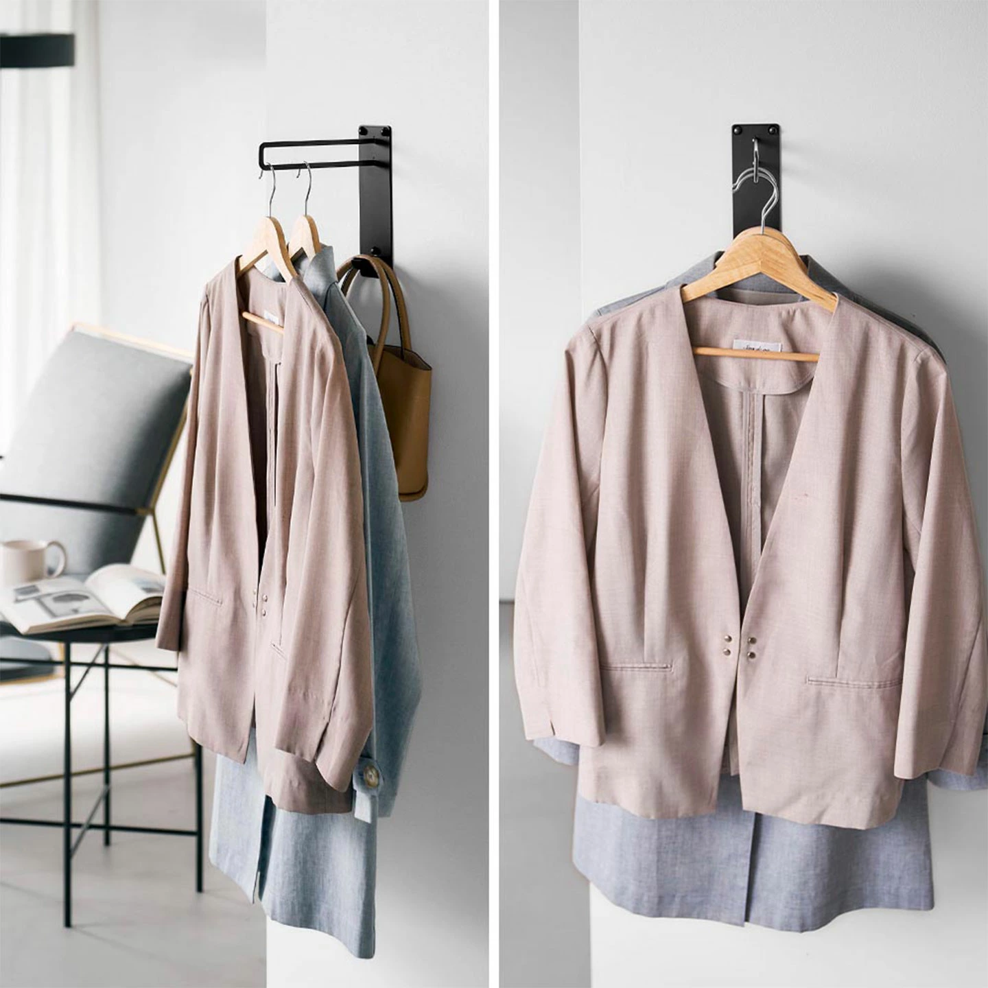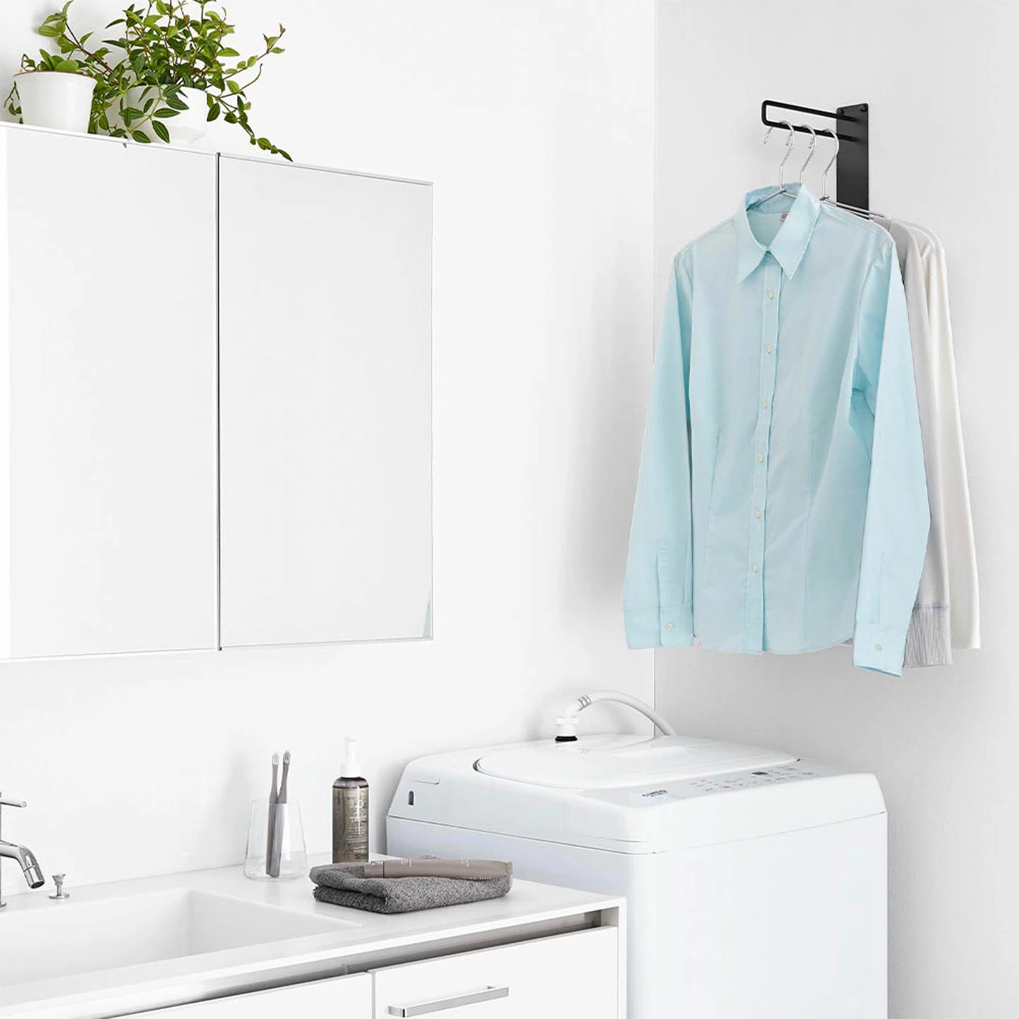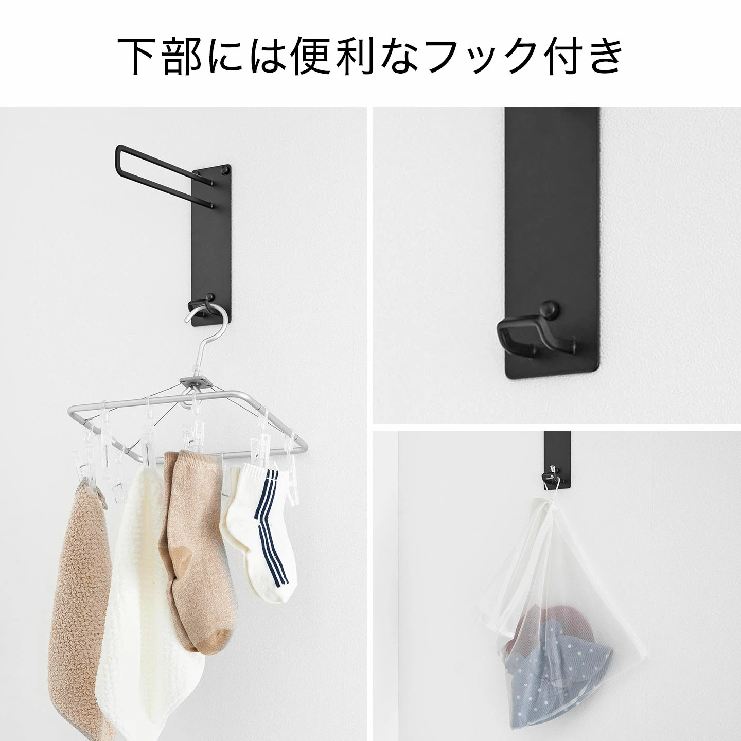 【壁付けちょい干しハンガー】石こうボードピンで簡単に設置できる、便利なちょい干しハンガーです。洗濯後の衣類をサッと一時掛けできて便利!フックにピンチハンガーを掛ければ、靴下などの小物干しもスムーズに行えます。洗濯ハンガーやピンチハンガー、洗濯ネットの収納にも役立ちます。洋服やバッグ収納用として、リビングに設置するのもおすすめです。壁の穴が目立ちにくい石こうボードピンで簡単取り付け。木ネジでも取り付け可能。