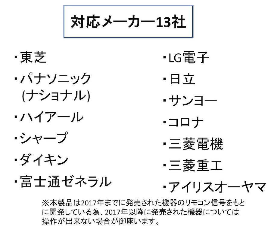 ●対応メーカー:東芝、パナソニック/ナショナル、ハイアール、シャープ、ダイキン、富士通ゼネラル、LG電子、日立、サンヨー、コロナ、三菱電機、三菱電工、アイリスオーヤマ。