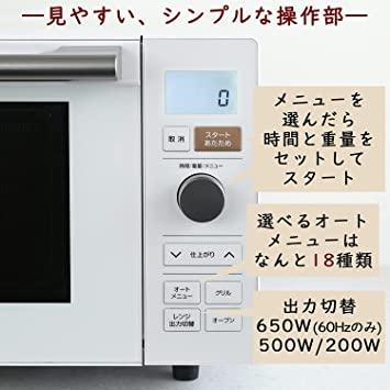【レンジ機能】50Hz時は2段階(200W/500W)、60Hz時は3段階(200W/500W/650W)での出力切替が可能。「お弁当」「お惣菜」「解凍」などよく使う項目はメニューを選択してスタートボタンを押すだけで、温度や時間を自動で設定してあたためてくれます。【トースト機能】上のヒーターで加熱し、食品の表面に焼き色を付けてくれるグリル機能で、こんがりおいしいトーストが焼き上がります。トーストは一度で食パン2枚まで焼くことができます。※トーストを焼く場合は片面が焼けたら裏返して裏面を焼いてください。【オーブン機能】上下のヒーターの加熱を温度センサーで調整し、設定した庫内温度で焼き上げます。グラタンやピザ、クッキーにスポ