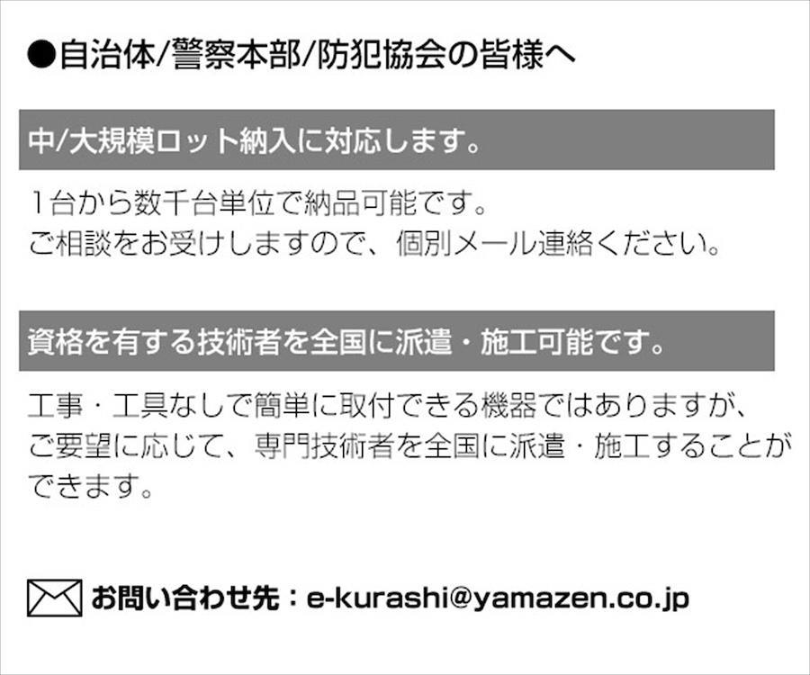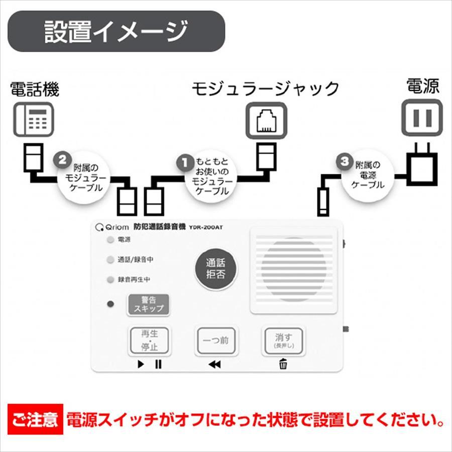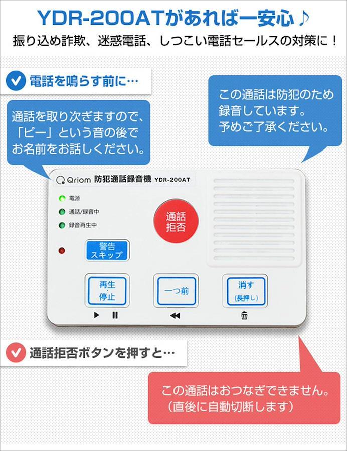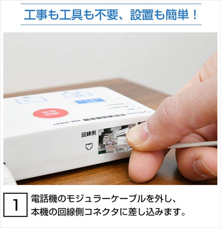 ◆◆公益財団法人 全国防犯協会連合会の詳細はこちら◆◆http://www.bohan.or.jp/●振り込め詐欺やオレオレ詐欺対策に有効な防犯通話録音機。●防犯用品の審査、推奨を行う公益財団法人全国防犯協会連合会の推奨商品。●しつこい勧誘セールス、ストーカー被害の防止にも有効。●かかってきた電話の冒頭に警告メッセージで応答(録音警告、名乗り促しアナウンス)。●取り付け工事不要、電話回線と電話機の間に接続するだけの簡単取付。●電源:DC9V、消費電力:1.2W-4.5W。●対応回線:アナログ2線式。●音声出力:3.5φミニ。●モジュラー4P:電話回線側、電話機側。●保存:内蔵メモリに自動循環上書き保存。●再生仕様:アナログ/音声出力端子。●付属品:モジュラーケーブル(1.0m)、ACアダプター、取扱説明書。●保証期間:お買い上げ日より1年間。(保証の範囲については、取扱説明書をご確認ください)