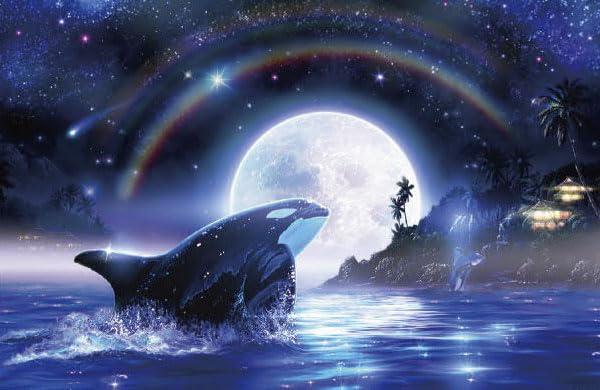 青々と輝く星空と満点の月、水面に映る光の中でシャチが大きく壮大な水しぶきを上げている作品。