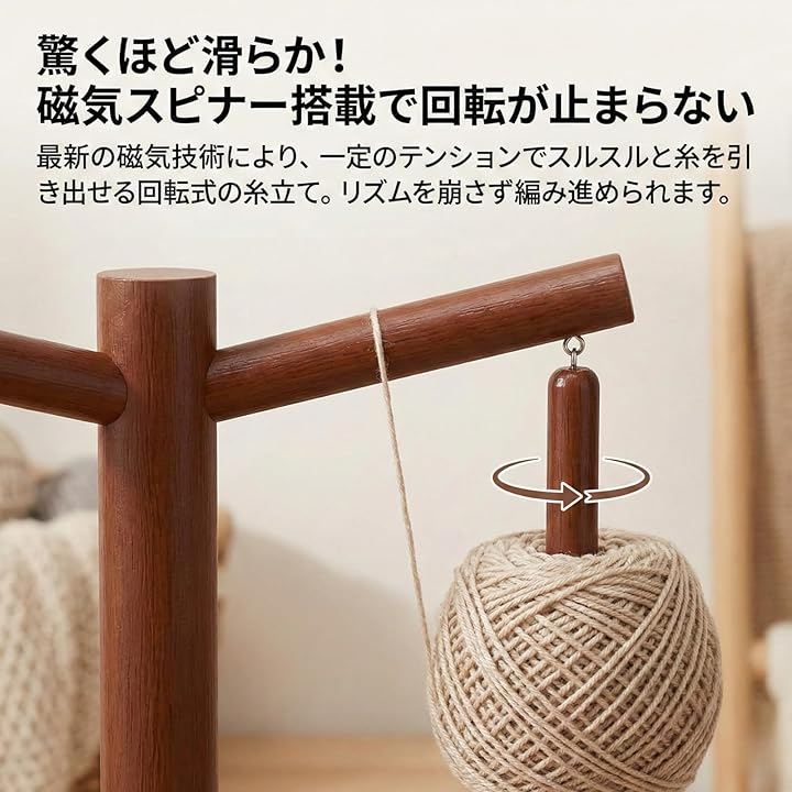 スムーズに回転する糸立て部分には磁気ジョイントを採用し、毛糸玉の着脱もワンタッチで完了します。