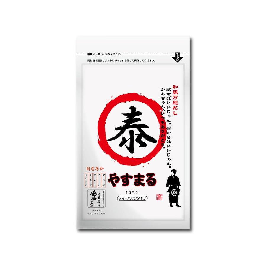 高橋商店の二枚看板商品『和風万能だし やすまる』のお試しパック(10包入り)。 ティーパックを破って、焼きそば・焼き飯・野菜炒め・和風パスタの味付けにもご使用いただける便利な万能だしです。 賞味期限:1年