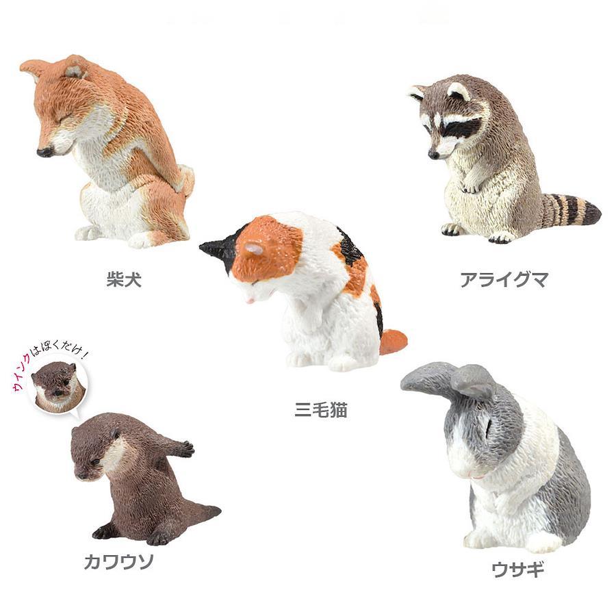 (柴犬、アライグマ、三毛猫、カワウソ、ウサギ)