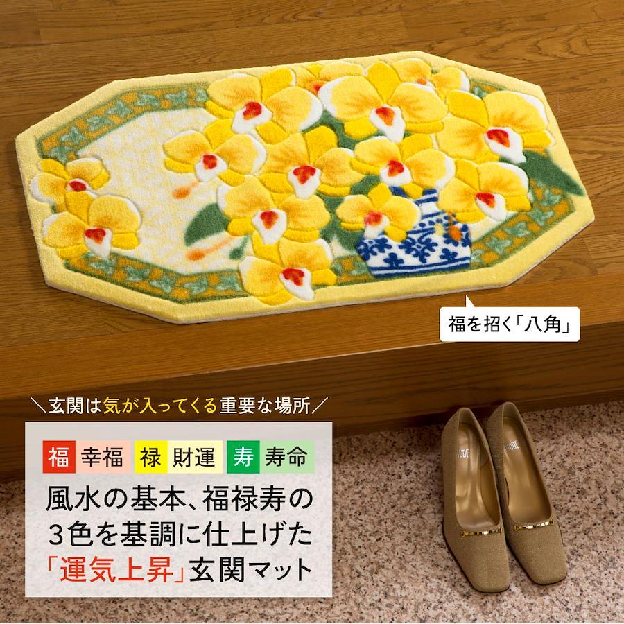 【商品名/型番】幸福の「黄色い胡蝶蘭」八角玄関マット / 4560162564568【商品サイズ】約50×80cm【材質】表面:アクリル100%裏面:ポリエステル、綿、その他【商品情報】●玄関を明るくする黄色い玄関マット●幸福の胡蝶蘭柄●八角の玄関マット【製造国】中国