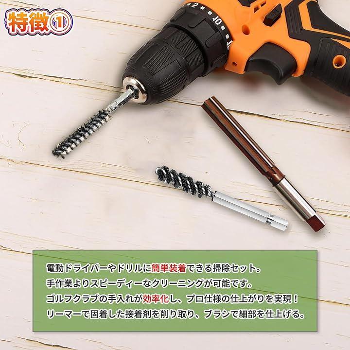 リーマーが固着した接着剤を削り取り、ブラシが細部を仕上げるセット構成で、 シャフト装着面のクリーニング精度が大幅向上。