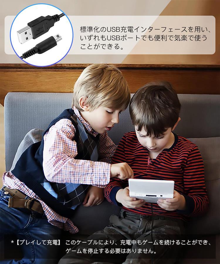 1. (Wide range of compatibility) USB charging cable compatible with all 3DS series. Compatible with New3DS/ New3DSLL /3DS /3DSLL/ i2DS /DSi /DSiLL/2DS Can charge any port that supports USB output. You can charge it via the Wii U USB port, USB charger for smartphones and iPhones, USB power bank, or USB port from your computer 2. Easy to Use: Uses a standardized USB charging interface that allows both USB ports to be conveniently and easily used. *【PLAY & CHARGE】 This cable allows you to continue playing while charging, so you don't have to stop the game 3. Incredibly Durable: It can be used without any problems even after bending over 20,000 times. It has excellent vibration and shock resistance 4. Adopts long cable length of about 47.2 inches (120 cm). Convenient for travel and business. Lightweight and compact design makes it easy to carry 5. (After Sales Service) If you have any questions, please feel free to contact us, we will contact you within 24 hours