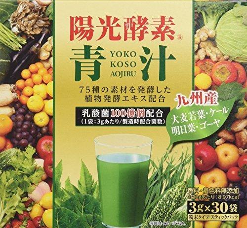4種類の九州産野菜、大麦若葉・ケール・明日葉・ゴーヤに、75種の素材を発酵させた植物発酵エキス(酵素)と、1億個の乳酸菌を配合した青汁です健康補助食品として1日1~2袋を目安に1袋を約80~100ml程度の水またはぬるま湯、牛乳等によく溶かしてお召し上がりください