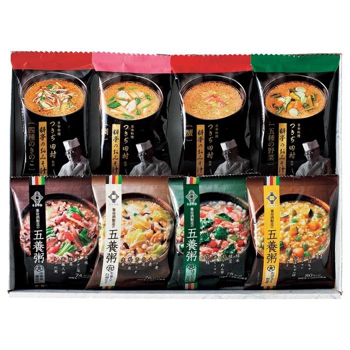 養命酒製造 五養粥 黄(かぼちゃ入り和風味)、緑(ほうれん草&豆乳味)、黒(中華風醤油味)、白(生姜入り白湯仕立て)、つきぢ田村監修 料亭のおみそ汁 蟹、鯛、四種のきのこ、五種の野菜×各1【卵、乳、小麦、かに】
