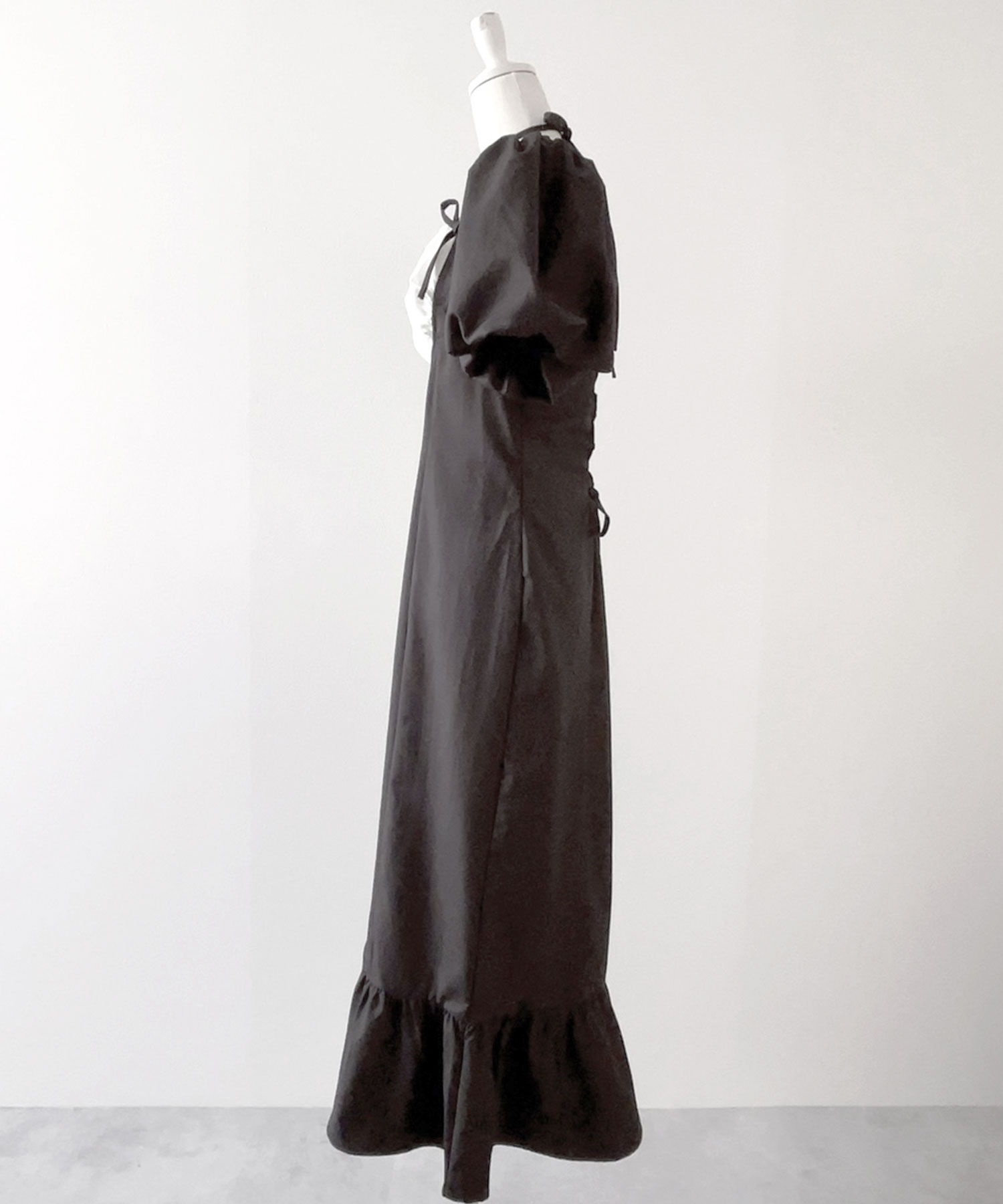 背中にはウエストを絞れるレースアップリボンがあり、マーメイドシルエットとの相乗効果でウエストのシルエットを際立たせます