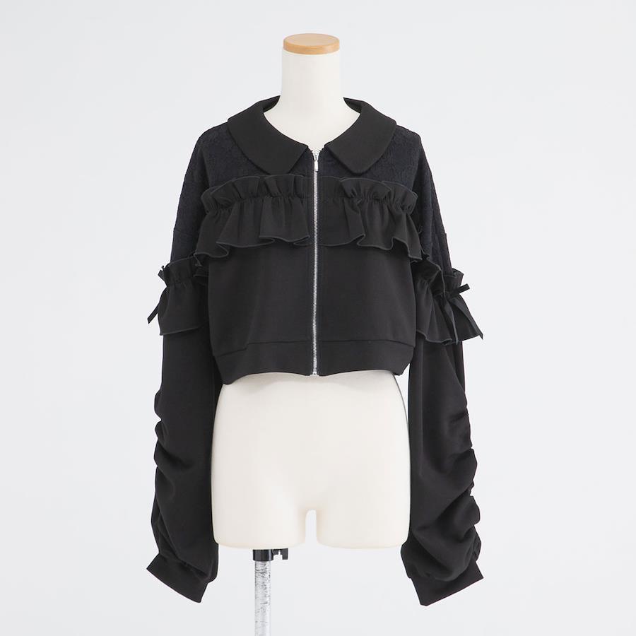 ガーリー×スポーティーが旬なブルゾンのご紹介♪【デザイン】たっぷりのフリルとヨークレースが目を惹くブルゾンです。フロントファスナーを開けて羽織れる仕様です。フリルは後ろ身頃までつけたので、後ろ姿まで抜かりなく可愛いデザイン◎お袖にちょこんと付けたリボンがアクセントに!襟元は丸みのある角襟にして、ガーリーさをプラスしました。お袖はギャザーをたっぷり寄せてボリューム感を出した、あざとくてイマドキなデザイン♪長すぎず短すぎない着丈にしたので、スタイルUP効果も抜群です!