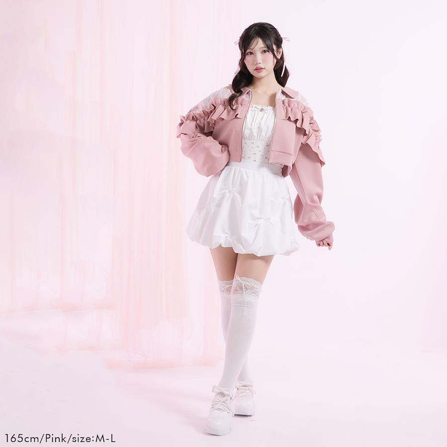 ガーリー×スポーティーが旬なブルゾンのご紹介♪【デザイン】たっぷりのフリルとヨークレースが目を惹くブルゾンです。フロントファスナーを開けて羽織れる仕様です。フリルは後ろ身頃までつけたので、後ろ姿まで抜かりなく可愛いデザイン◎お袖にちょこんと付けたリボンがアクセントに!襟元は丸みのある角襟にして、ガーリーさをプラスしました。お袖はギャザーをたっぷり寄せてボリューム感を出した、あざとくてイマドキなデザイン♪長すぎず短すぎない着丈にしたので、スタイルUP効果も抜群です!