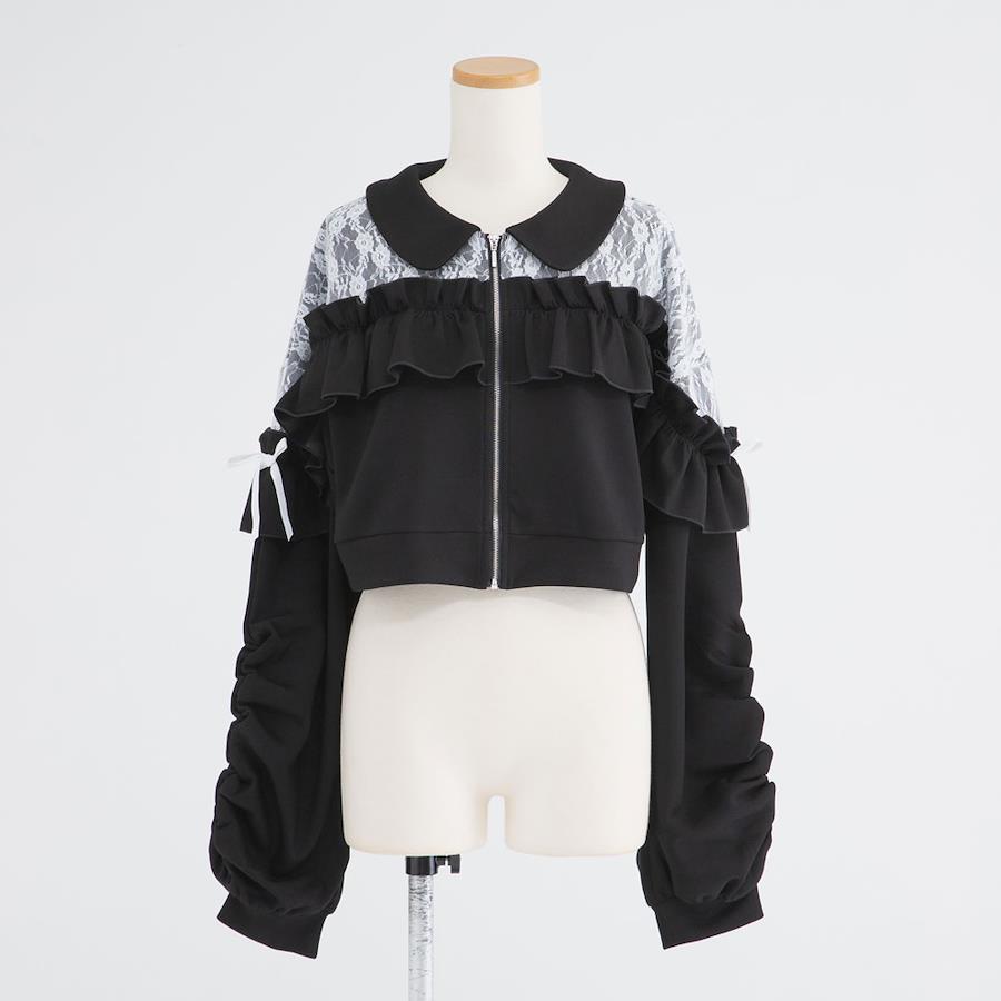 ガーリー×スポーティーが旬なブルゾンのご紹介♪【デザイン】たっぷりのフリルとヨークレースが目を惹くブルゾンです。フロントファスナーを開けて羽織れる仕様です。フリルは後ろ身頃までつけたので、後ろ姿まで抜かりなく可愛いデザイン◎お袖にちょこんと付けたリボンがアクセントに!襟元は丸みのある角襟にして、ガーリーさをプラスしました。お袖はギャザーをたっぷり寄せてボリューム感を出した、あざとくてイマドキなデザイン♪長すぎず短すぎない着丈にしたので、スタイルUP効果も抜群です!