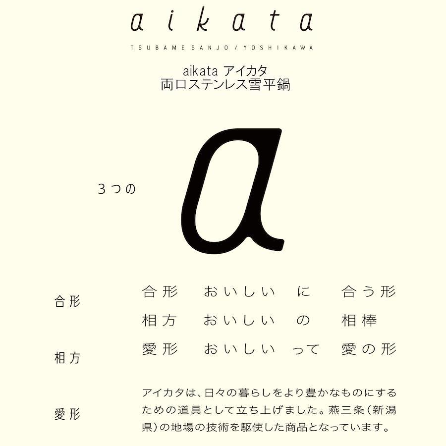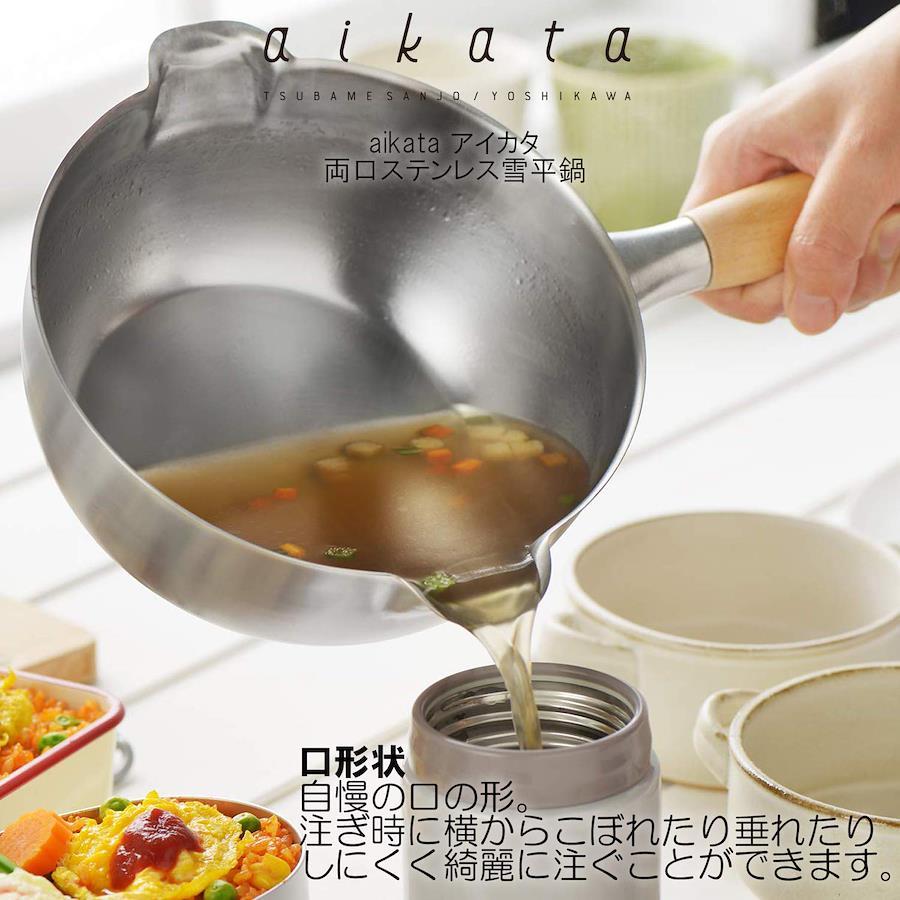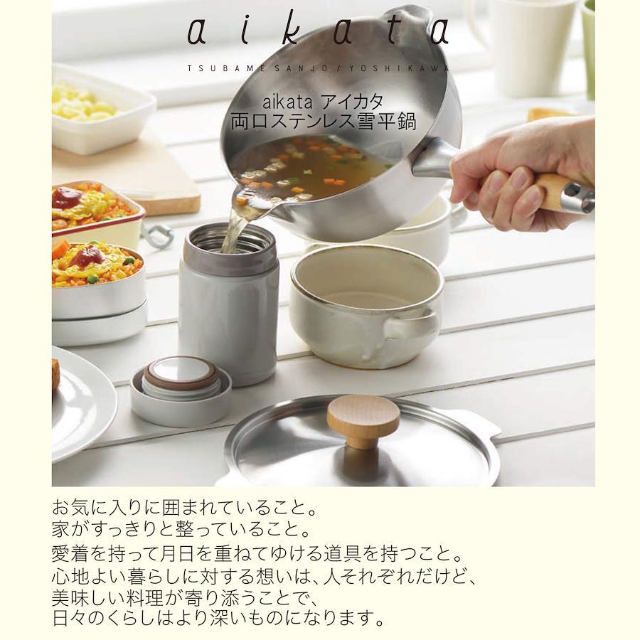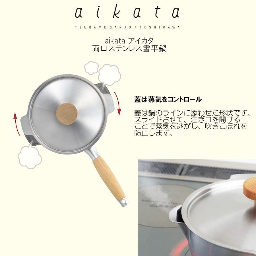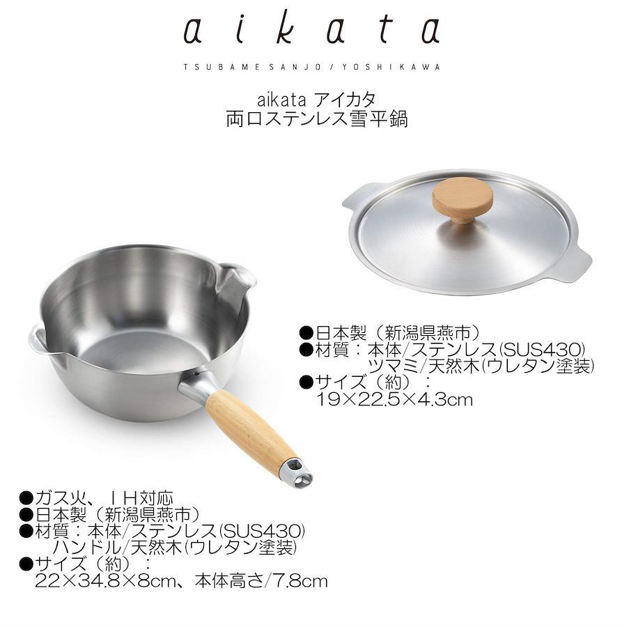 サイズ(約): 鍋 22x34.8x8cm(本体高さ 7.8cm)、蓋 19x22.5x4.3cm素材・材質:素材・材質:●雪平鍋 本体/ステンレス(SUS430) ハンドル/天然木(ウレタン塗装) ●蓋/ステンレス(SUS430) ツマミ/天然木(ウレタン塗装)生産国:日本(ハンドルの材料に一部中国製)雪平鍋自慢の口の形。注ぎ時に横からこぼれたり垂れたりしにくく綺麗に注ぐことができます。ガス火はもちろんIHも対応。形も持ち易い木製の取っ手が素敵で、丸みを帯びた形が煮汁をまんべんなく滞留してくれます。蓋は蒸気をコントロール。蓋は鍋のラインに添わせた形状です。スライドさせて、注ぎ口を開けることで蒸気を逃がし、吹きこぼれを防止します。またツマミの形ががフラットなので、置いたときに転がらず安定して置けます。aikata/アイカタは、日々の暮らしをより豊かなものにするための道具として立ち上げました