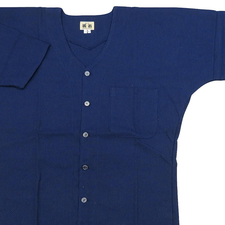 ■義若オリジナルの無地鯉口シャツです。■素材には、こだわりの刺し子生地を使用しております。■平織りの生地とはひとあじ違った風合いが、「粋」を主張しています。■素材 綿100%■中(M)サイズ 身丈69cm 身幅48cm ゆき64cm