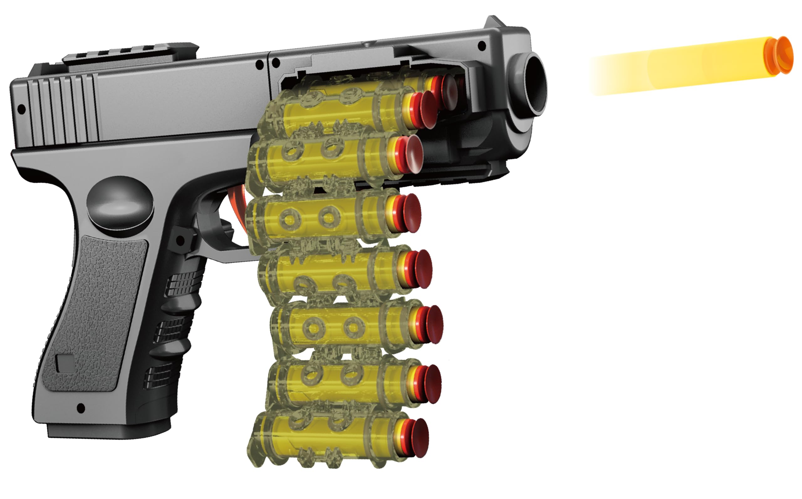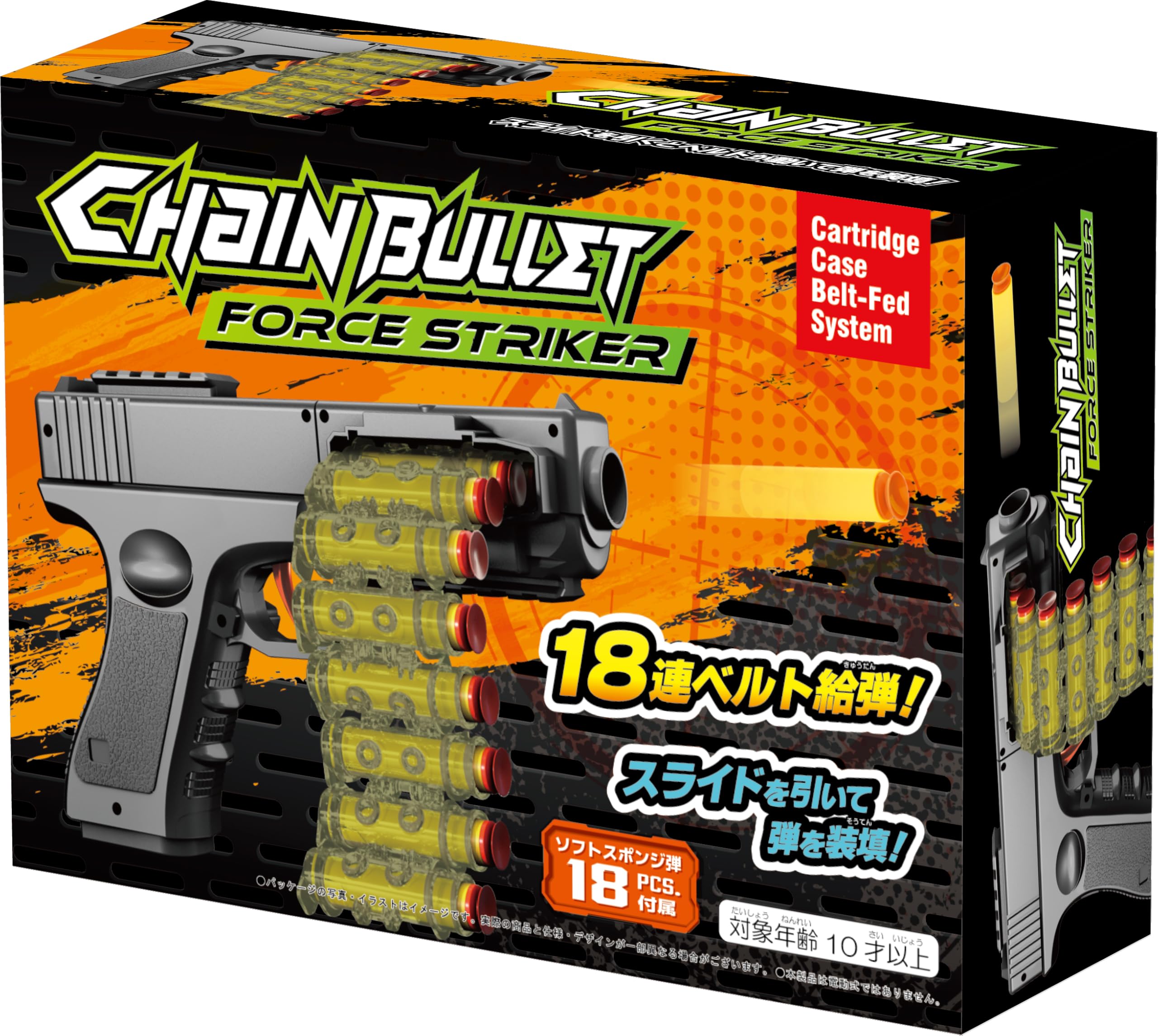 迫力のベルト給弾が楽しめるチェインバレットシリーズ18連薬莢が刺激的!スライドを引いて弾を装填できます。弾はソフトスポンジを使用。セット内容:本体×1、薬莢×18、弾丸×18 / 対象年齢:10歳