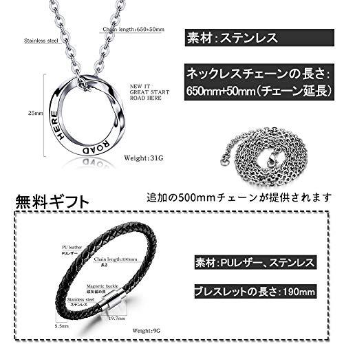 【製品情報】商品内容:メビウスリングネックレス*1、PUレザーブレスレット*1、500mmチェーン*1。ネックレス、チェーン素材:ステンレス、ブレスレット素材:PUレザー、ステンレス。サイズ:リングの内径は25mmで、日本サイズ19リング相当です、ネックレスチェーンの長さ:650mm+50mm/500mm+50mm、ブレスレットの長さ:190mm。カラー:シルバー、ブラック。付属品:yoursfs専用ケース、ジュエリーメンテナンスマニュアル。