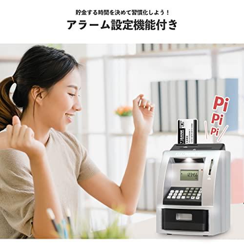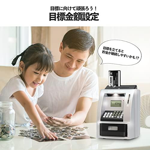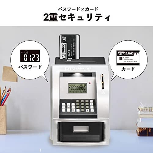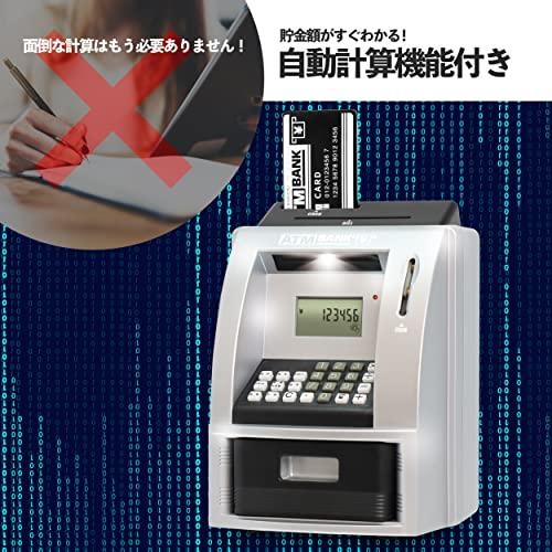 カードとパスワードのWセキュリティー。 残高を自動計算してくれる自分だけの多機能ATMバンクです!バラエティー雑貨としてプレゼントにも最適です。 硬貨の種類を気にせずに貯金できる、自動識別機能が付いています。また自動で計算してくれるので貯まった金額が目に見える優れものです! 画面には時刻が表示され、アラーム機能も搭載しています。貯金の習慣をつけるのであれば、アラーム設定で毎日決まった時間に貯金ができます。 貯金額の目標設定もできるので、達成感を味わいやすい!目標金額に向かって貯金の習慣づけができます♪ 【メイン機能】■硬貨の児童識別 ■貯金の目標設定 ■残高の自動計算 ■時刻表示・アラーム機能 ■電卓機能 ■サウンド搭載(ON/OFF切り替え可能)【その他の機能】■ライトの点灯 ■金額表示部分の液晶モニター 【セット内容】・ATMバンク本体 ・セキュリティーカード1枚 【本体詳細】・サイズ:約W16cm×H22cm×D14cm ・重量:約730g(パッケージ含む)