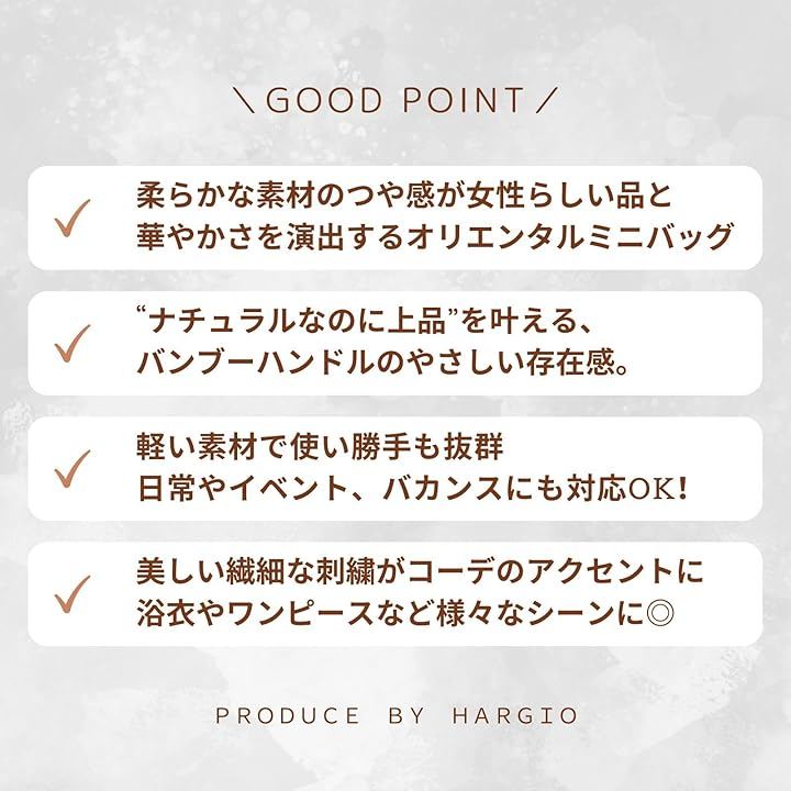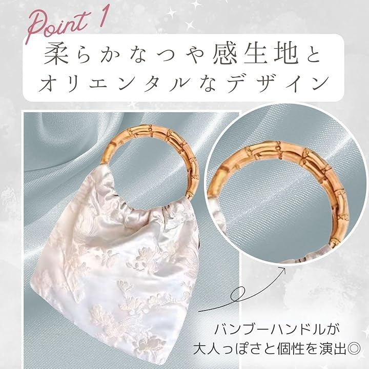 柔らかな素材のつや感が女性らしい品と華やかさを演出するオリエンタルミニバッグ