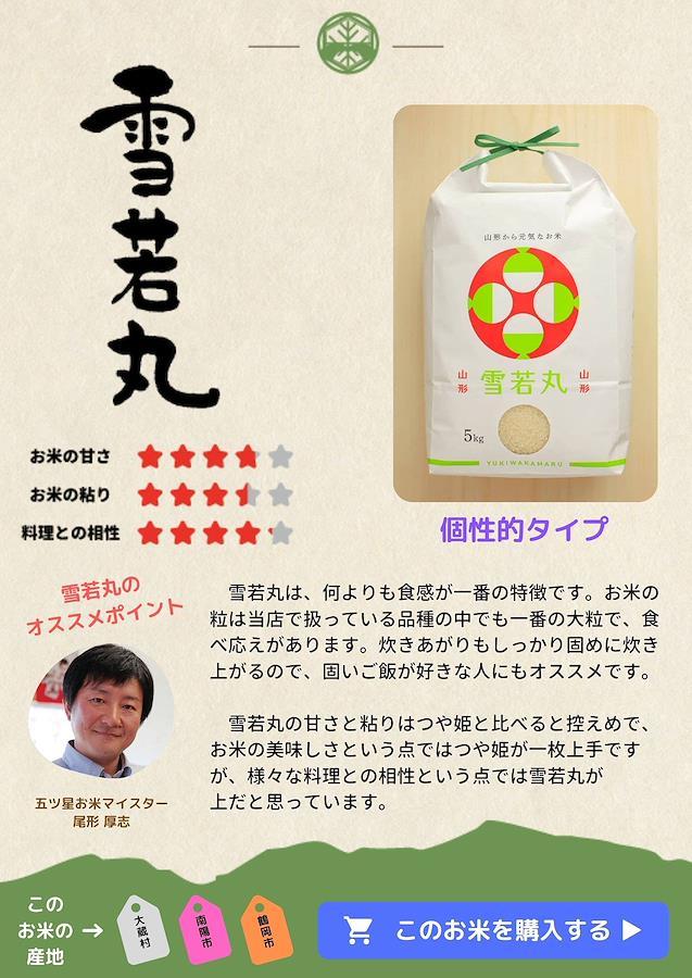 平成30年デビューの山形県の新品種米・雪若丸 農薬使用8割減・化学肥料使用7割減で、通常の1/5の量しか農薬を使用していない雪若丸です。【雪若丸の特徴】粘り…★★★☆ 甘み…★★★★ 食感…個性的 おすすめ料理…丼物・魚料理【産地紹介:南陽市】山形県南部の南陽市は人口約3万2千人の地方都市です。ぶどうやリンゴなどの果物の栽培が盛んで、稲と果樹園の複合農家さんが多い地域でもあります。また、麺大国の山形県でも特に、ラーメンが美味しい地域です。【生産者紹介:しまさき農園】生産者の島崎真人さんは、しまさき農園の三代目。まだ30代の若手農家さんですが、徹底的にお米の食味にこだわり、毎年新しい栽培方法などにチャレンジしている意欲的な農家さんです。「あなたが選ぶ日本一おいしい米コンテスト」では、優良金賞を受賞されています。【ご注文頂いてから精米します】お米は精米した瞬間から食味が落ちていきます。そのため、当店では、精米したての鮮度の良いお米を召し上がって頂けるよう、ご注文を頂いてからご注文頂いた数量のみを、そのつど精米しています。