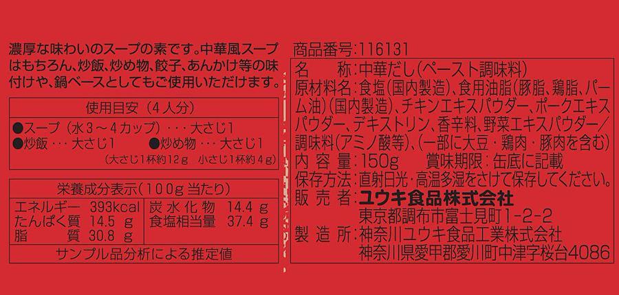原材料:食塩、動植物油脂、鶏エキス、豚エキス、澱粉分解物、野菜エキス、香辛料、調味料(アミノ酸等) 栄養成分表示:100g当たり エネルギー 393kcal、たんぱく質 14.5g、脂質 30.8g、炭水化物 14.4g、ナトリウム 14724mg、食塩相当量 37.4g