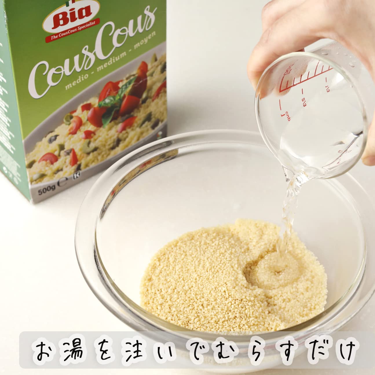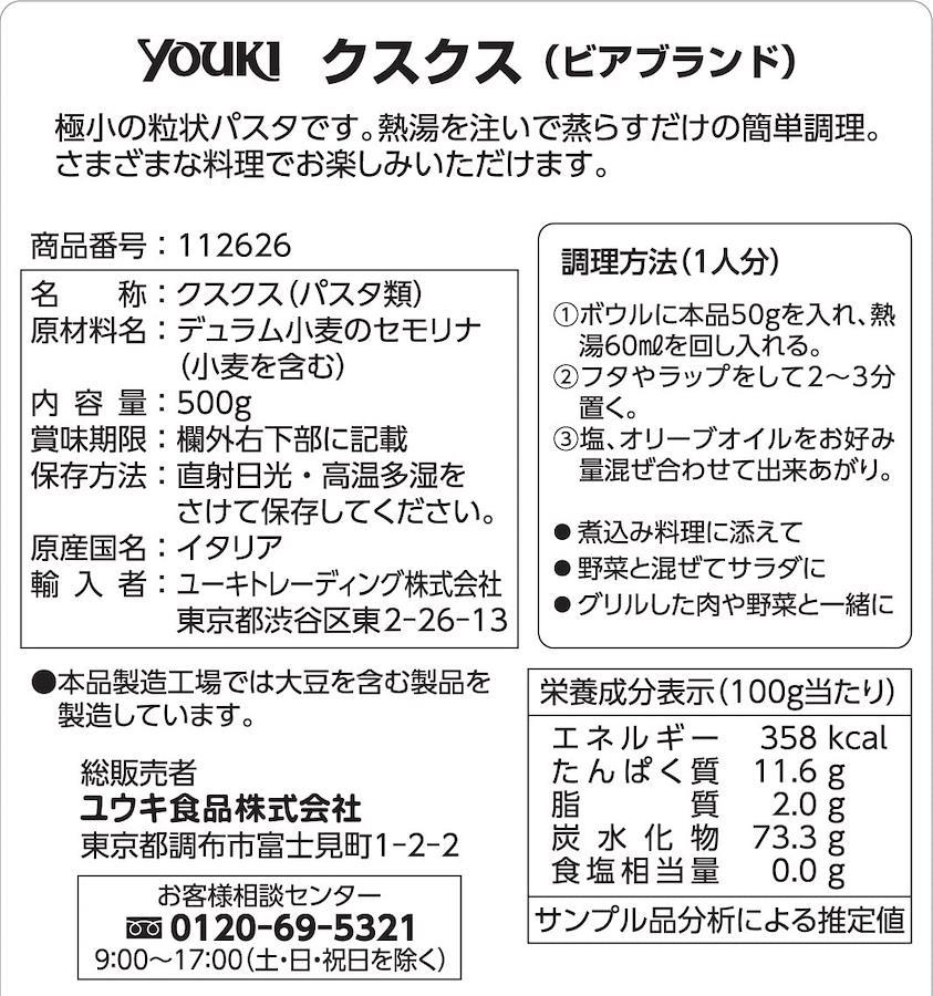 パスタの国・イタリアからやってきたクスクス。クスクスは、デュラムセモリナ粉から作るパスタの一種でして。熱湯を加えて数分蒸らすだけで簡単に戻せます。メイン料理の付け合わせやトマトソースなどをかけてパスタ料理スープやサラダの具材(タブレっていうらしい・・)広い用途に利用できます。【作り方】は簡単 1人分(1)本品50gに熱湯60ml (2)ふたをして2、3分蒸らす (3)お好みで塩・オリーブ油パスタ茹で上がるまで待てない時どうぞ。