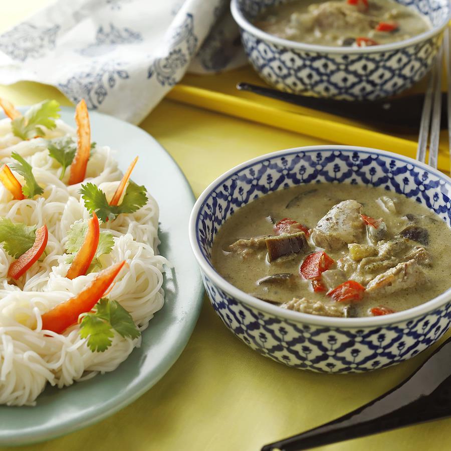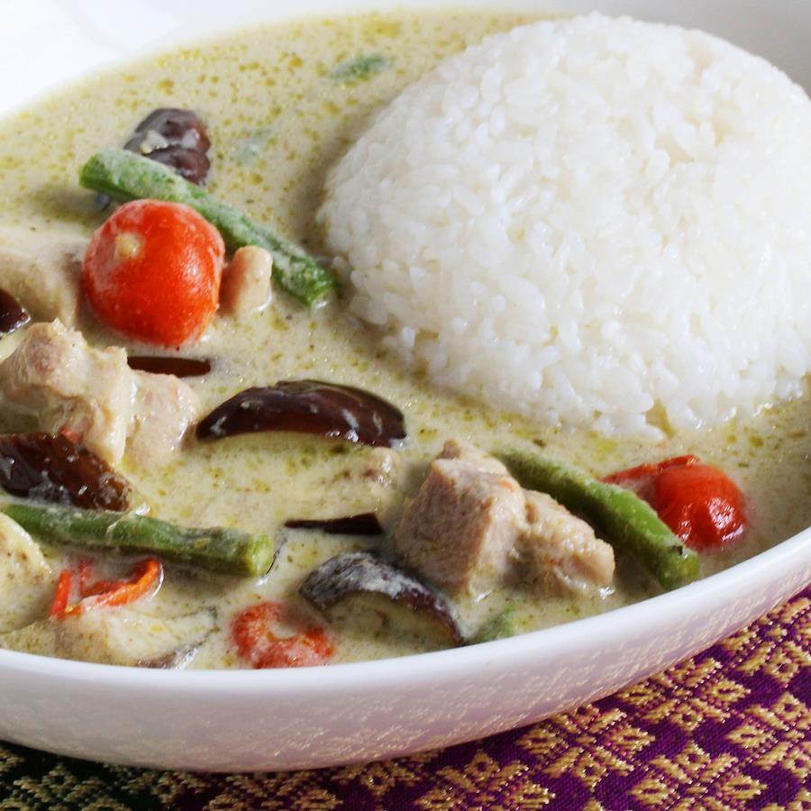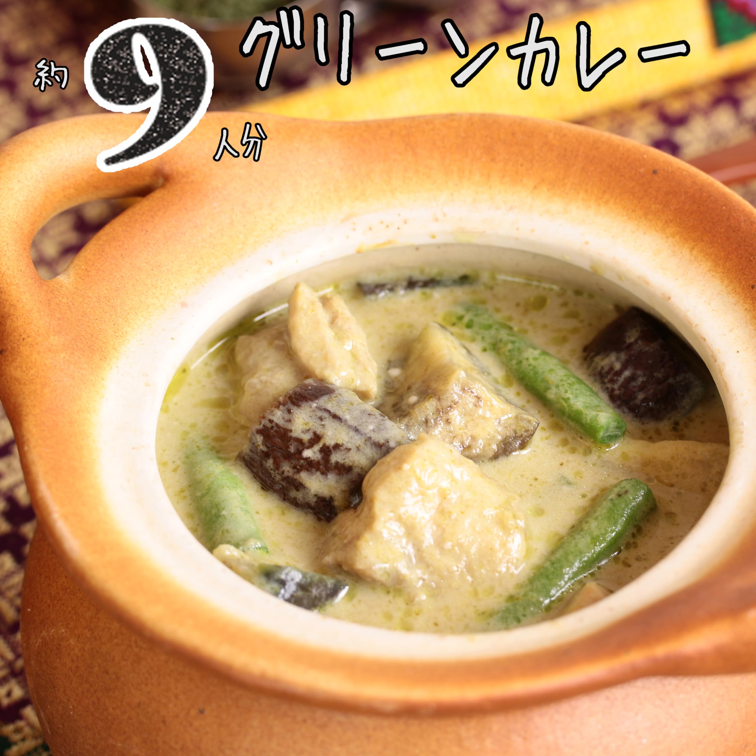 定番グリーンカレー、青唐辛子を使用した、刺激的な辛口タイプ。【グリーンカレー材料 4人分】カレーペースト50g、ココナツミルク400ml、水200ml、お好みの肉200g、いんげん10本、なす2本、ナンプラー小さじ2、砂糖小さじ2(1)鍋に油を熱しペーストを弱火で炒め、水・ココミル入れる。(2)適度な大きさに切ったお肉・野菜を入れる。(魚介類や、豆類でもよし)(3)仕上げにナンプラーと砂糖で味を調え、できあがり。