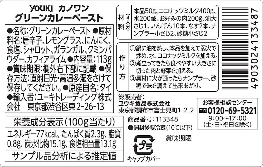 本品(113g)でタイのグリーンカレー約9人前タイ料理定番グリーンカレー 青唐辛子を使用した刺激的な辛口タイプ。原材料:唐辛子、レモングラス、にんにく、食塩、シャロット、ガランガル、クミンパウダー、カフィアライム原産国:タイ【重要】メーカーによる商品リニューアルに伴いパッケージ(内容量も含む)変更が行われた場合、新パッケージでお届け致します事ご了承願います。
