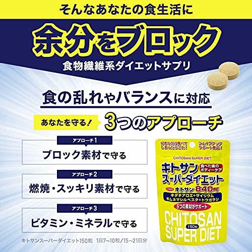 ●健康補助食品として1日7~10粒を目安に、2~3回に分け、水などと共にお召し上がりください。●空腹時及び一度に大量のお召し上がりはお控えください。最初は少量よりお召し上がりください。●約2~3週間を目安にお召し上がりください。●原材料名をご参照の上、食品アレルギーのある方、妊産婦、授乳中の方、お子様はお召し上がりにならないでください。●摂取する量によってはお腹が緩くなる場合がありますが、その場合は量を控えてください。●アレルギー体質等まれに体質に合わない方もいますので、お召し上がり後体調のすぐれない時は中止してください。●薬を服用中あるいは通院中の方は念のため医師にご相談の上お召し上がりください。●食生活は、主食、主菜、副菜を基本に、食事のバランスを。●吸湿しやすい成分が含まれているため、開封後はチャックをしっかりと閉めて保存してください。●小さなお子様の手の届かない所に保存してください。脂分の多いこってりした料理にキトサン、甘いものにはギムネマシルベスタ、スッキリを応援するキダチアロエ、食物繊維が豊富なサイリウムハスク、燃焼サポート系ダイエットで人気のトウガラシを配合しました。 また、ダイエット時に不足しがちなカルシウム、鉄やビタミンを配合しています。5つの素材で、シェイプアップを応援。キトサンはカニやエビなどの甲殻類などから抽出される食物繊維で、こってりした食事が多い方などのヘルシー素材として注目されています。本品は、このキトサンの他にも、主食や甘いものを好む方に人気のギムネマシルベスタやキダチアロエ、サイリウム、トウガラシの4つの植物素材を配合しました。また不足しがちなビタミン・ミネラルを加えたシェイプアップをサポートする健康補助食品です。 食物繊維キトサンなどブロック素材を中心に燃焼、スッキリ素材も配合したダイエット応援商品です[国内製造品] 内容量 : 45g(1粒300mg×150粒) / 商品サイズ (幅X奥行X高さ) : 100×20×150mm 規格成分 : [本品10粒(3.0g)中] キトサン:840mg、キダチアロエ葉末:300mg、ギムネマシルベスタエキス末:300mg、サイリウム:300mg、香辛料(トウガラシエキス):30mg 原材料 : キダチアロエ葉末、ギムネマシルベスタエキス 末、乳糖/セルロース、キトサン、サイリウム、骨焼成カルシウム、グリセリン脂肪酸エステル、ビタミンC、香辛料、クエン酸第一鉄ナトリウム、ナイアシン、ビタミンA、ビタミンD、ビタミンB2、ビタミンB1、(一部に乳成分、かにを含む) 栄養成分 : [本品10粒(3.0g)中] 熱量:2.7kcal、たんぱく質:0.40g、脂質:0.11g、炭水化物:2.21g(糖質:0.03g、食物繊維:2.18g)、食塩相当量:0.011g、カルシウム:22.20mg、鉄:1.50mg、ビタミンB1:0.60mg、ビタミンB2:0.75mg