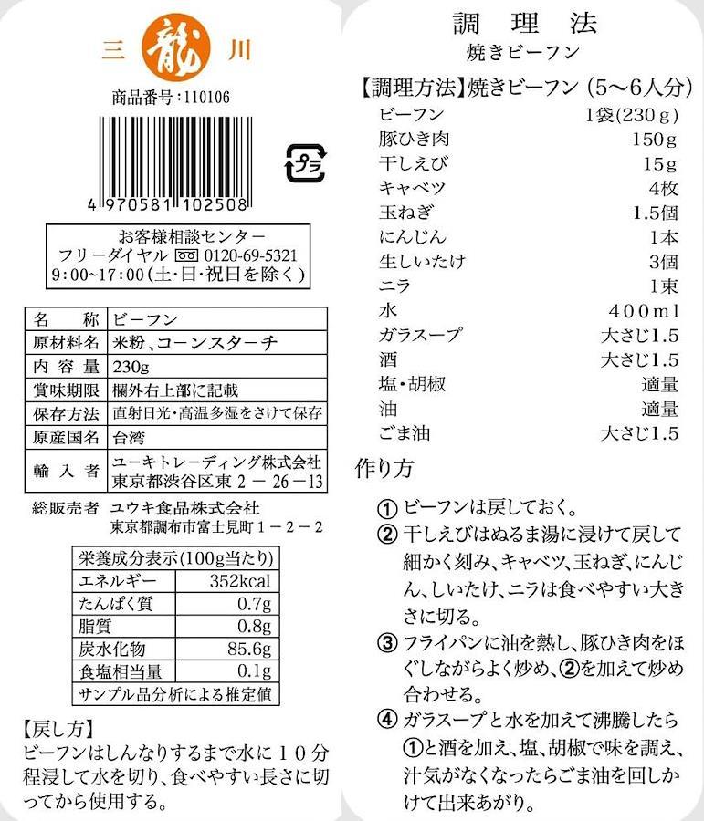 内容量:230gゆで時間約1分 ビーフン約6人分原材料:米粉、コーンスターチ原産国:台湾商品サイズ(高さ×奥行×幅):240mm×30mm×185mm【重要】メーカーによる商品リニューアルに伴いパッケージ(内容量も含む)変更が行われた場合、新パッケージでお届け致します事ご了承願います。