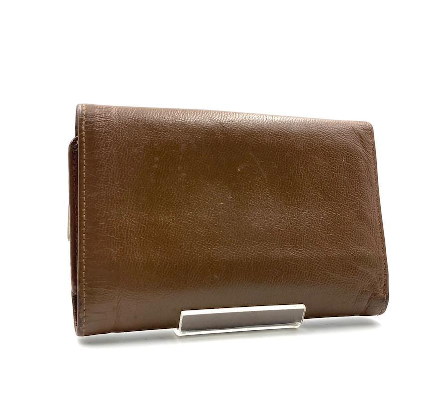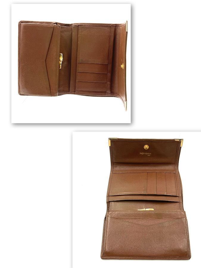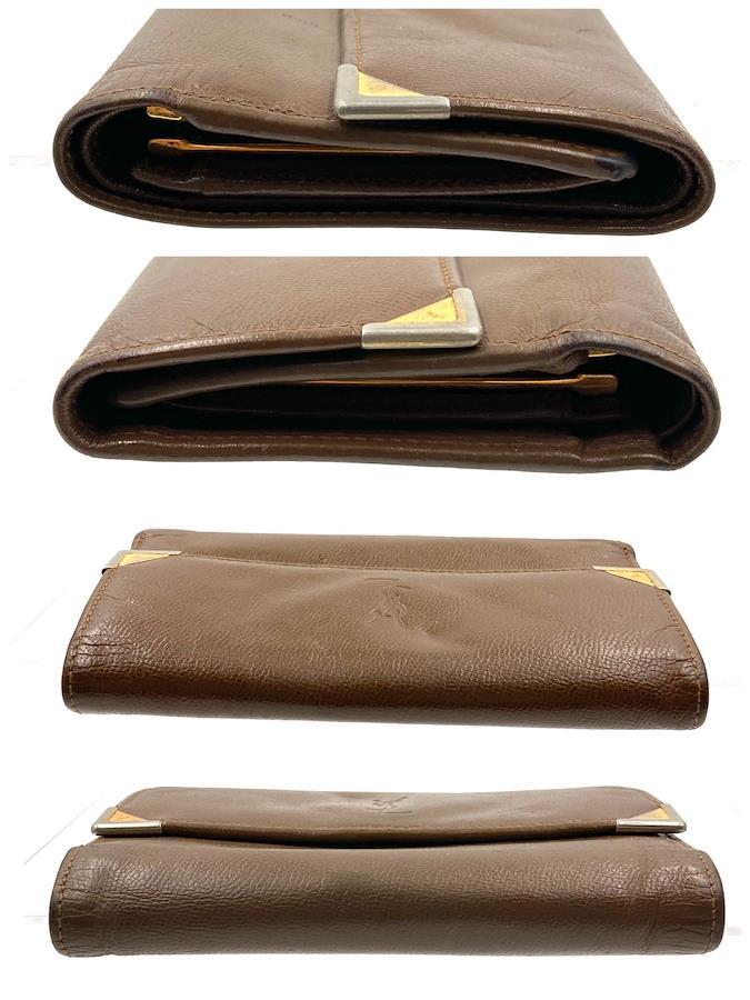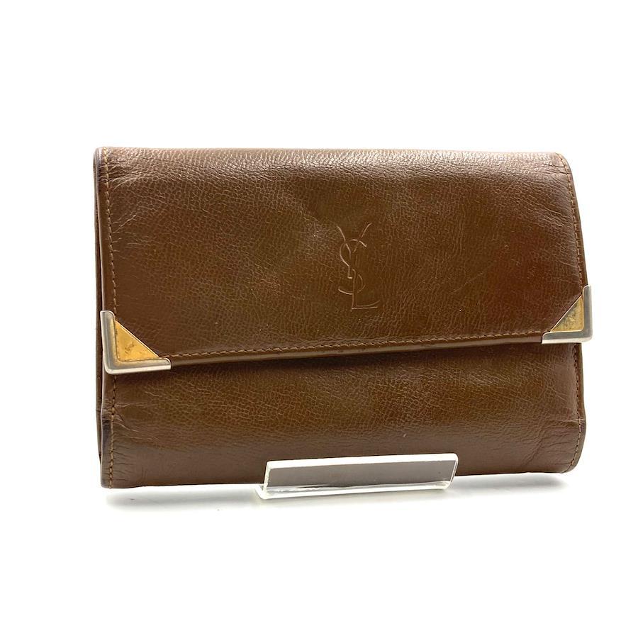 ■商品概要Yves saint Laurent イヴサンローランYSLロゴ型押し ロゴエンボス三つ折り財布三角プレートレザー 本革ブラウンゴールド金具がま口レディースラグジュアリー 高級 ハイブランド