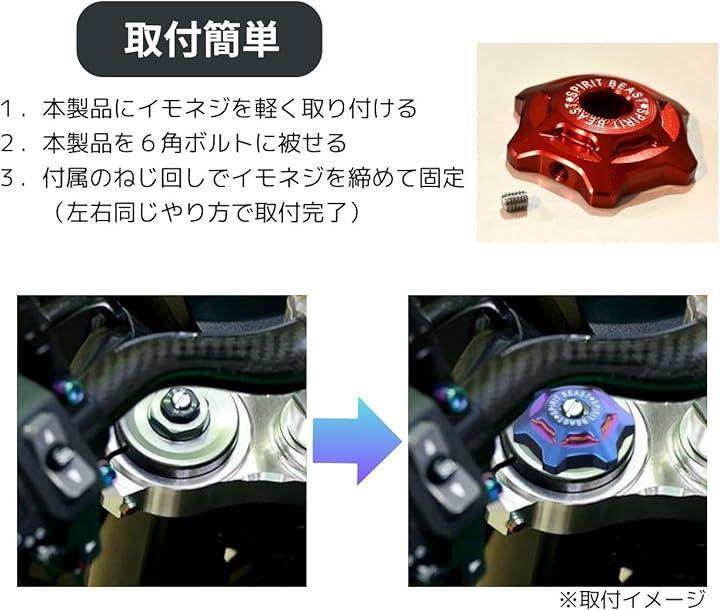 「取付簡単」本体をフロントフォークのトップキャップ(六角ボルト)に被せ、イモネジで固定して完了。