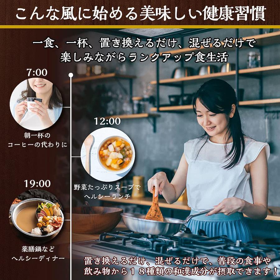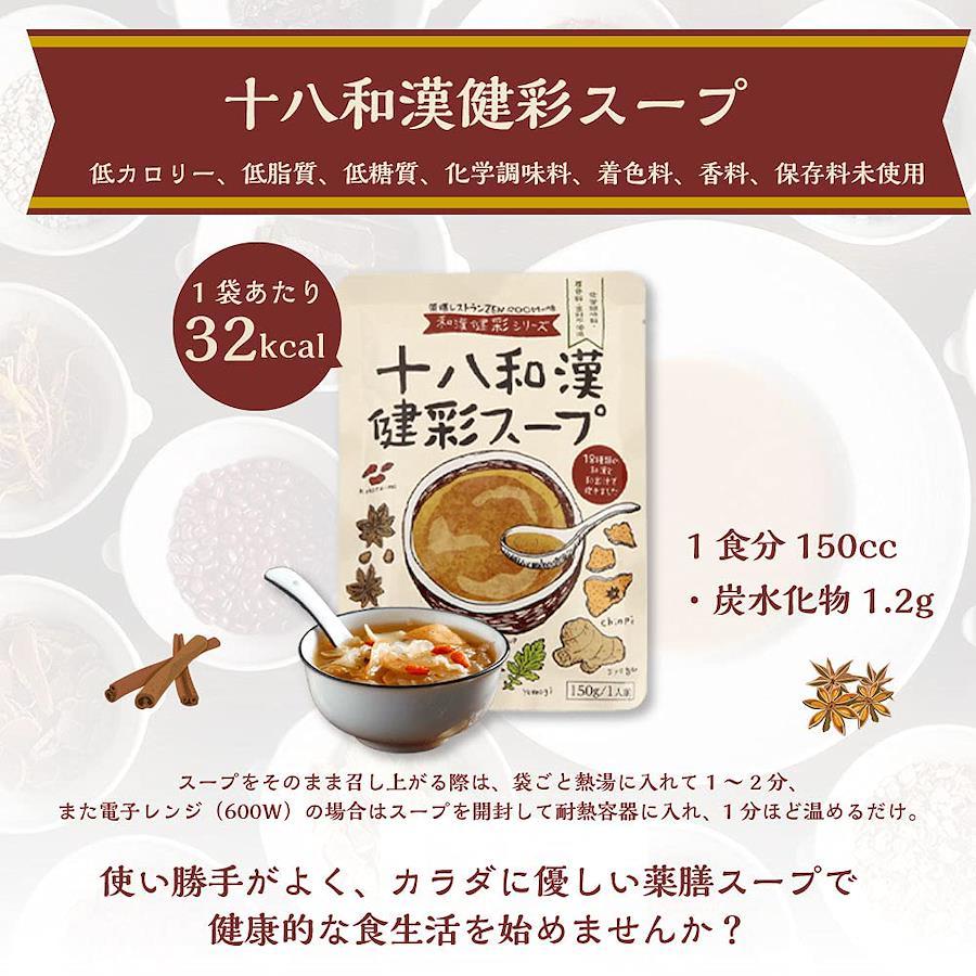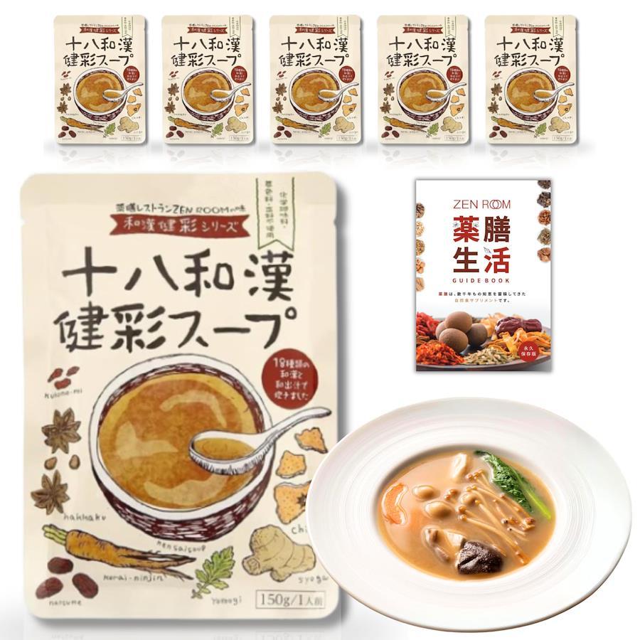 ?【本格的な薬膳!無添加ダイエットスープが1123日かかってようやく完成】 自由が丘ZEN ROOMで人気の薬膳スープをご家庭でも! 十八和漢健彩スープは、18種類の和漢と国産烏骨鶏や昆布、干し椎茸、複数の魚節などをじっくり煮出した出汁で作られています。使い勝手がよく、カラダに優しく、効率よく栄養を吸収できるスープという形に行き着きました。「もっとクセが強い風味と思ったけど飲みやすく美味しい!」という声を多数頂戴しているように、素材そのものの味わいを活かし、風味豊かに仕上げています。薬膳専門店の自慢の味を常温保存可能な無添加レトルト食品 詰め合わせ6点でお届けいたします。?【18種類のスーパーフード「和漢」】 ダイエットスープには18種(陳皮・なつめ・乾姜・小豆・金針菜・クコの実・桂皮・山薬・夏草花・南蛮毛・八角・はと麦・花椒・へんず・よもぎ・さんしゅゆ・高麗人参・紅花)の和漢がたっぷり含まれています。※商品原材料表記は一部異なりますが同じ食材になります。和漢はカラダの健康維持のため、身体を内側から温め、疲れた体にやさしく届きます。本品の配合にあたり、薬科?学の客員教授兼薬剤師の先生が監修を担当しました。?【体にやさしい無添加スープ】 本品は着色料・香料・保存料などを一切使わない無添加スープ(レトルト食品)です。化学調味料不使用で、後味が心地良く素材そのものの味を最大限生かしました。「保存がきくレトルトなのに無添加で大丈夫?」と思われるかもしれませんが、衛生管理が厳しく、多くの実績がある工場で、丁寧に製造した結果、無添加でありながら、賞味期限を長くすることが実現できました。お店の味そのままを商品化するのに3年ほどかかりましたが、今では健康志向が高いお客様を中心にご愛飲いただいています。?【そのままでも、出汁に置き換えても】 無添加スープは、 うまみ調味料に頼らない本格的な味わい。じっくりと煮込むことで?然の旨味が沁みだしています。 そのまま飲んでも料理アレンジに使ってもおいしく召し上がれます。スープは麺との相性が良く、フォーなどの米粉麺と合います。お味噌汁、雑炊、各種スープやお鍋のベース、カレーを健彩スープで割ったスープカレーなどとしても重宝!いつものお出汁やスープに、さっと置き換えるだけで、専?店の本格和漢の栄養パワーと?味に簡単グレードアップ!スープをタンブラーなどにスープを入れて、珈琲代わりに飲む「ブロス」は美容や健康に気を遣う層に人気。?【「十八和漢健彩スープ」商品詳細】 1袋あたりの容量150gに対して、カロリー:32kcal・脂質1.2g ・炭水化物2.4g と低カロリー、低脂質、低糖質。 スープをそのまま召し上がる際は、袋ごと熱湯に入れて1~2分、また電子レンジ(500W)の場合はスープを開封して耐熱容器に入れ、1分30秒温めるだけ。簡単手軽な健康習慣を始めてみませんか?【重要】メーカーによる商品リニューアルに伴いパッケージ(内容量も含む)変更が行われた場合、新パッケージでお届け致します事ご了承願います。