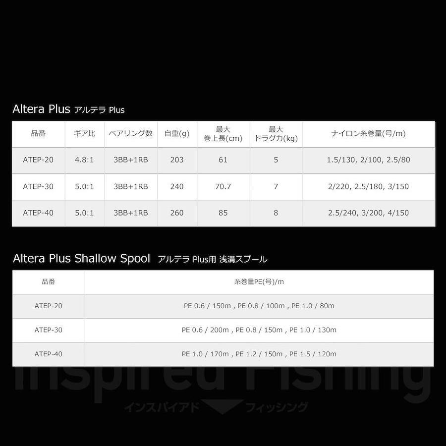ギア比:5.0:1●ベアリング数:3BB+1RB自重:260g●最大巻上長:85cm●最大ドラグ力:8kg標準スプール 2.5号/240m, 3号/200m, 4号/150m●PE糸巻量(#号):#1/470, #1.5/320, #2/235糸巻量替えスプール (PE):1.0号/170m, 1.2号/150m, 1.5号/120m品番:ATE-40 PLUS部門名: ユニセックス