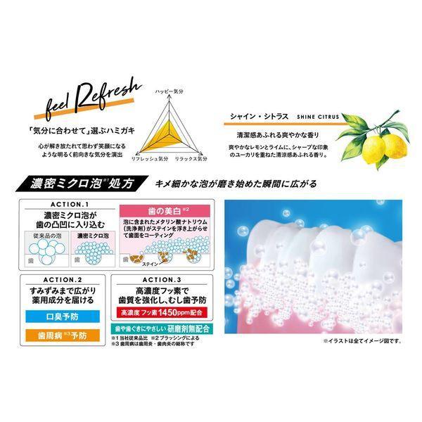 「気分に合わせて選ぶハミガキ」心が解き放たれて、思わず笑顔になるような、明るく前向きな気分を演出!●シャイン・シトラス・清涼感あふれる爽やかな香り。爽やかなレモンとライムに、ショープな印象のユーカリを重ねた清涼感あふれる香り。●濃密ミクロ泡処方キメ細かな泡が、磨き始めた瞬間に広がる。(1)濃密ミクロ泡が歯の凹凸に入り込み、歯の美白。泡に含まれたメタリン酸ナトリウム(洗浄剤)がステインを浮き上がらせて歯面をコーティング。(2)すみずみまで広がり薬用成分を届け、口臭・歯周病予防。殺菌成分LSSが口臭原因菌を徹底殺菌して、口臭の発生を予防。CPC・IPMP2種の殺菌成分で、歯肉炎の原因菌を殺菌。β-グリチルレチン酸(抗炎症成分)が歯ぐきの腫れを抑えて、歯周病を防ぐ。(3)高濃度フッ素で歯質を強化し、虫歯予防。高濃度フッ素1450ppm配合。●歯や歯ぐきにやさしい研磨剤無配合。