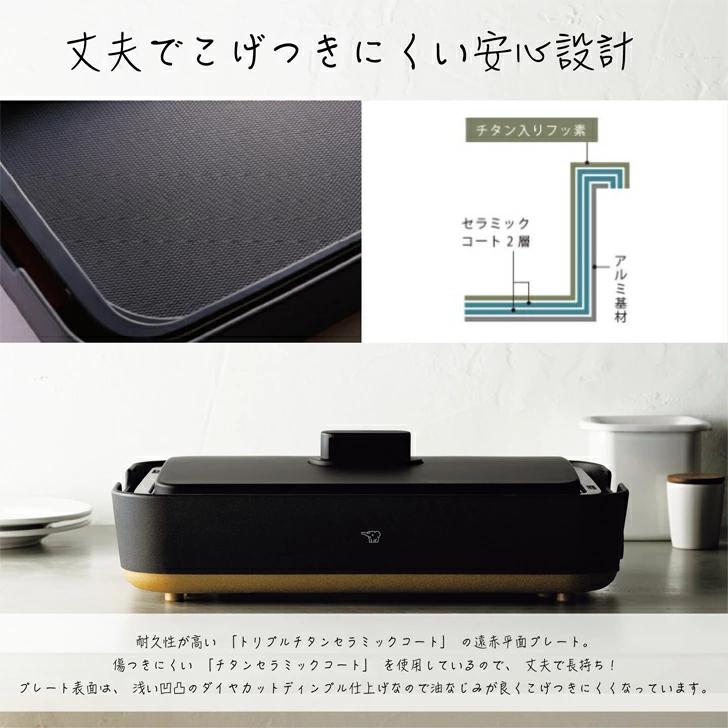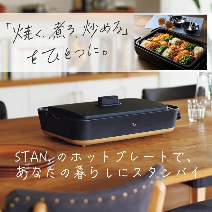 商品情報メーカー名象印サイズ本体外寸:幅445mm×奥行305mm×高さ140mmプレート内寸:幅374mm×奥行254mm×深さ40mm 4.8kg素材/材質本体ガード:フェノール樹脂、ポリプロピレンフタ:印刷鋼板、フェノール樹脂深型プレート:アルミダイカスト(遠赤トリプルチタンセラミックコート)セット内容ホットプレート、レシピブック、樹脂ヘラ、プラグ&収納ケース商品説明【現代の暮らしに合わせたSTAN.シリーズ】象印マホービンの新しい家電『STAN.』シリーズの深型ホットプレートになります。「焼く」「煮る」「炒める」も1台で出来る深さ4cmの深型プレートを採用。スマートなデザイン性を残しつつ、使いやすいホットプレートになりました。【耐久性に優れたチタンセラミックコート】トリプルチタンセラミックコートの遠赤平面プレートを採用することにより、丈夫で傷つきにくく、金属ヘラも使用できます。また温度調節は保温から250度までダイヤル式で細かく調節できるから、料理に合わせてご利用できます!【収納だけじゃないケース】付属のプラグ収納ケースは収納だけでなくレシピスタンドにもなります!20種類のメニューが掲載されたレシピビックも付いてくるので、普段の料理から特別な日のメニューまでホットプレートをフル活用♪【嬉しい丸洗い】プレート、ヒーター、本体ガードと取り外せるので、プレートはもちろん本体ガードも丸洗いが可能!地味に汚れやすい本体も丸洗いできるので、後片付けが楽になります♪(ヒーターは丸洗い不可です。)