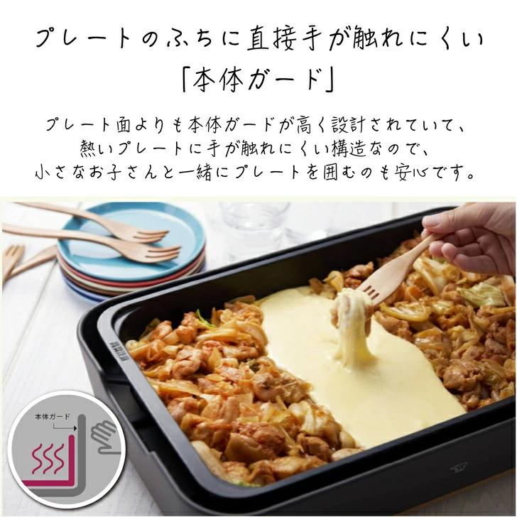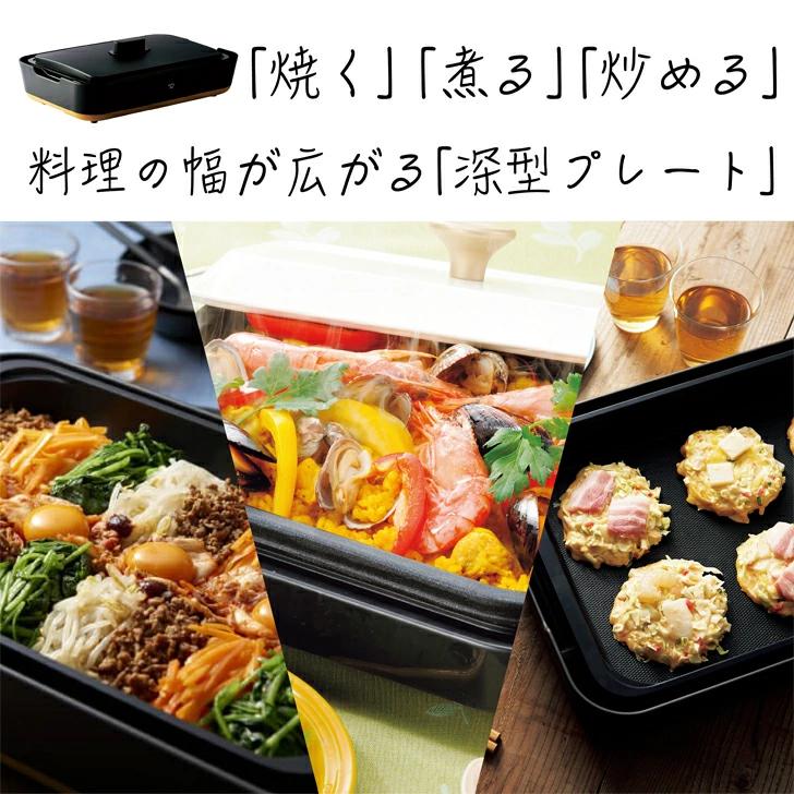 「焼く」「煮る」ができる深さ4cmの「深型プレート」、プレート表面は、ダイヤカットディンプル仕上げなので油なじみが良くこげつきにくく、温度調節プラグケースは、レシピブックスタンドとして使えます。