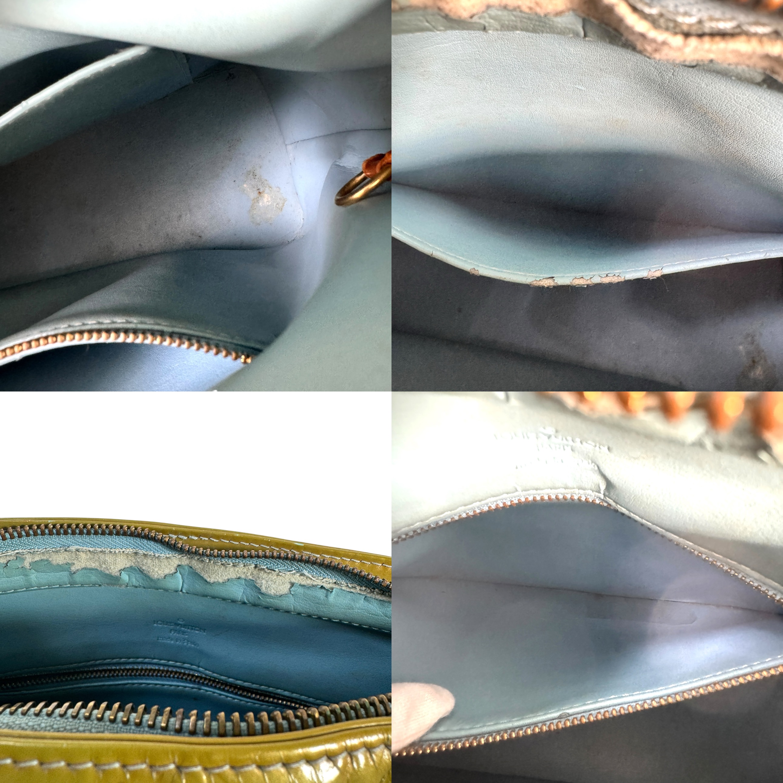 【商品説明】持ち手取れ、ヌメ皮にヤケ、黒ずみ、シミ汚れ、表面に黒ずみ、シミ汚れ、テープ跡、内側に剥がれ、汚れなど、使用感のとても強い中古品になりますので、ご購入の際はご確認ください。