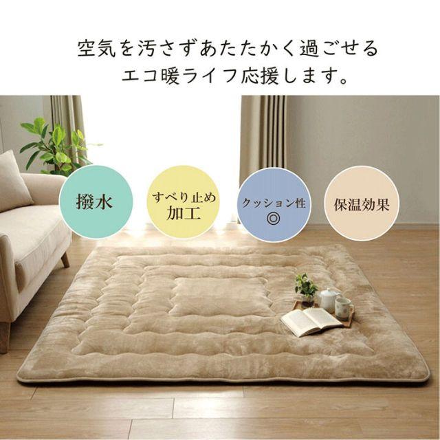 ◎3カラー(ベージュ/ブラウン/グリーン)、3サイズ(190×190cm/190×240cm/190×260cm)のバリエーションからお選びいただけます。◎表生地は撥水加工がされているので,汚れてもお手入れが簡単です。◎6層の中にはアルミシート・ポリエチレンシートを使用しています。蓄熱・断熱機能があるため、冬の寒い日でも床からの底冷えを軽減してくれます。◎ボリュームがあるので、ふっくらとした座り心地です。◎表地にはなめらかなタッチ感のフランネルを使用しています。