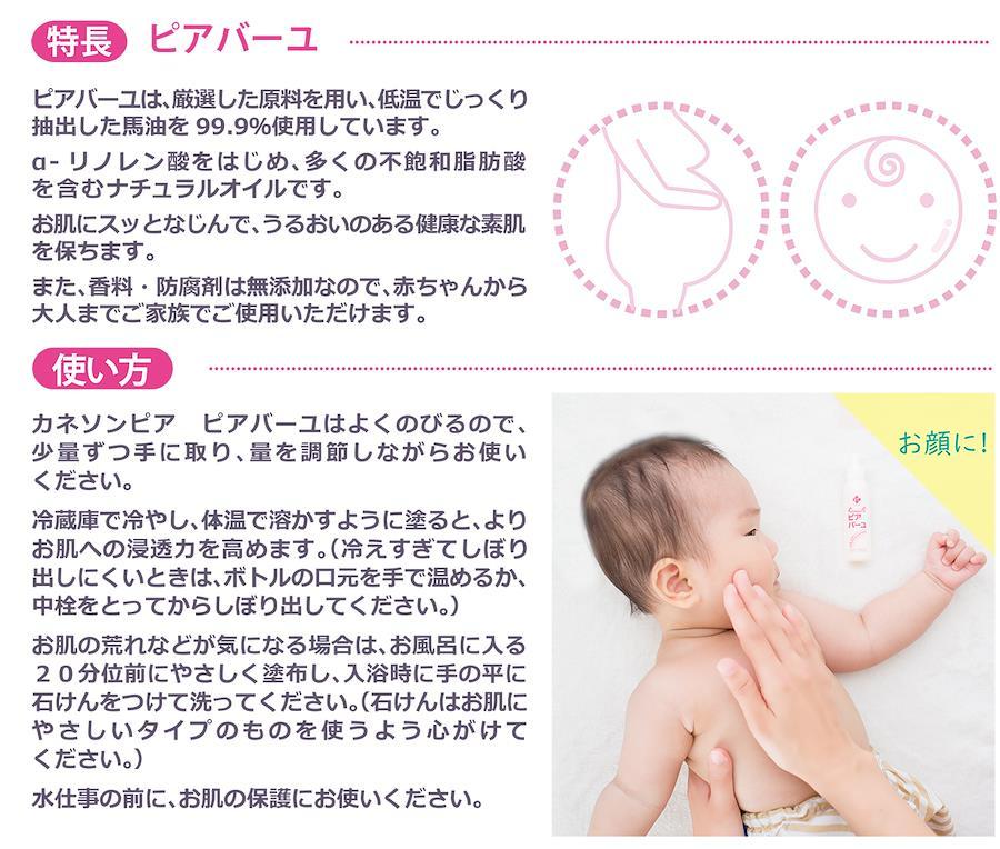 【特長】ピアバーユは厳選した原料を用い、低温でじっくり抽出した馬油を使用しています。α-リノレン酸をはじめ、多くの不飽和脂肪酸を含むナチュラルオイルです。お肌にスッとなじんで、うるおいのある健康な素肌を保ちます。また、香料・防腐剤は無添加なので、赤ちゃんから大人までご家族でご使用いただけます。