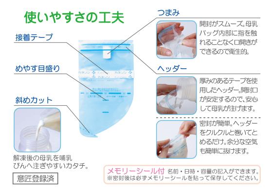 【ご使用方法】新生児は細菌に対して抵抗力が弱いので、お取り扱いは清潔にお願いします。手指を石けんでよく洗ってから母乳バッグを取り扱ってください。①上部の透明部分の切り込み口をヘッダーにそって引き裂きます。※ヘッダーをはがさないでください。②ヘッダーの中央部を白いつまみ側に折り目を付けてから、ヘッダーの両端を持ちます。③白いつまみを手前に引っ張り、母乳バッグの口を開けます。※母乳バッグ内に指を入れたり、息を吹き込んだりしないでください。④ヘッダーの両端を持ちながらもう一方の手で母乳バッグの下部を引っ張り、底まで広げてください。⑤片手でヘッダーの両端を持ち母乳バッグの口を開けたままコップの中で受けて、母乳をゆっくり注いでください。※最大容量表示のライン以上入れないようにしてください。破れや漏れの原因となります。(めやす目盛りは、白いつまみを持って自然にたまった状態での表示ですが、あくまでめやすですので正確ではありません。)⑥母乳バッグの空気を抜き、ヘッダー部分を接着テープにむかって手前に3回巻き込みます。(※25mlの場合は2回巻き込みます。)つぎに接着テープ部分のはくり紙をはがし、さらに1回巻き込み、しっかり押さえてとめてください。⑦あらかじめ名前とさく乳日時、容量を記入しておいたメモリーシールを⑥でしっかり押さえとめた部分の上にしっかりと貼ってください。そして速やかに冷凍庫(冷蔵庫)で保存してください。※冷凍庫で保存する場合は、母乳バッグ表面の水滴をよく拭き取り、1個ずつラップやポリ袋に包んでください。(庫内にくっつき取り出せなくなったり、冷凍庫内の他の食品類とくっついてしまい、フィルム外側のナイロン層がはがれてしまうことがあります)
